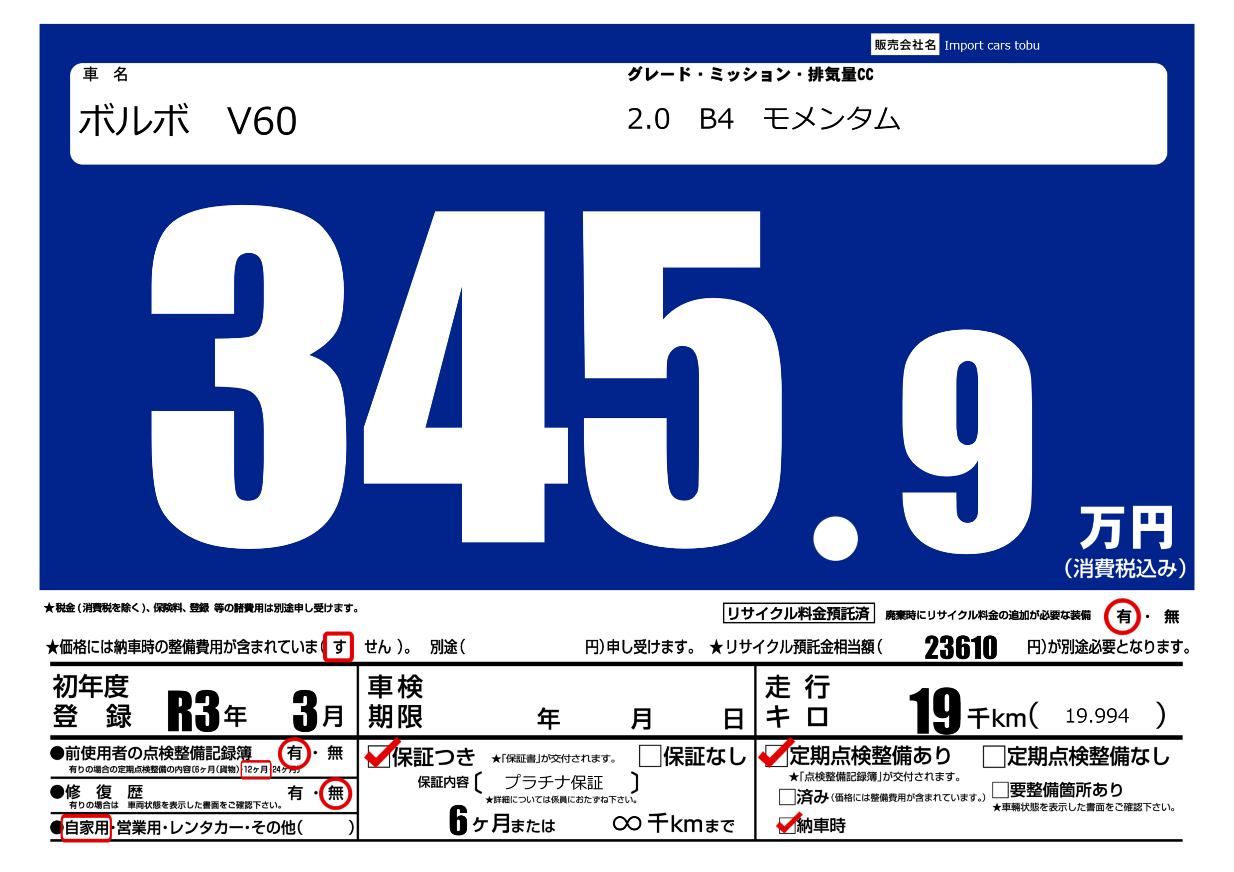 保証付き 保証内容( プラチナ保証) 6ヶ月または(∞)千kmまで |