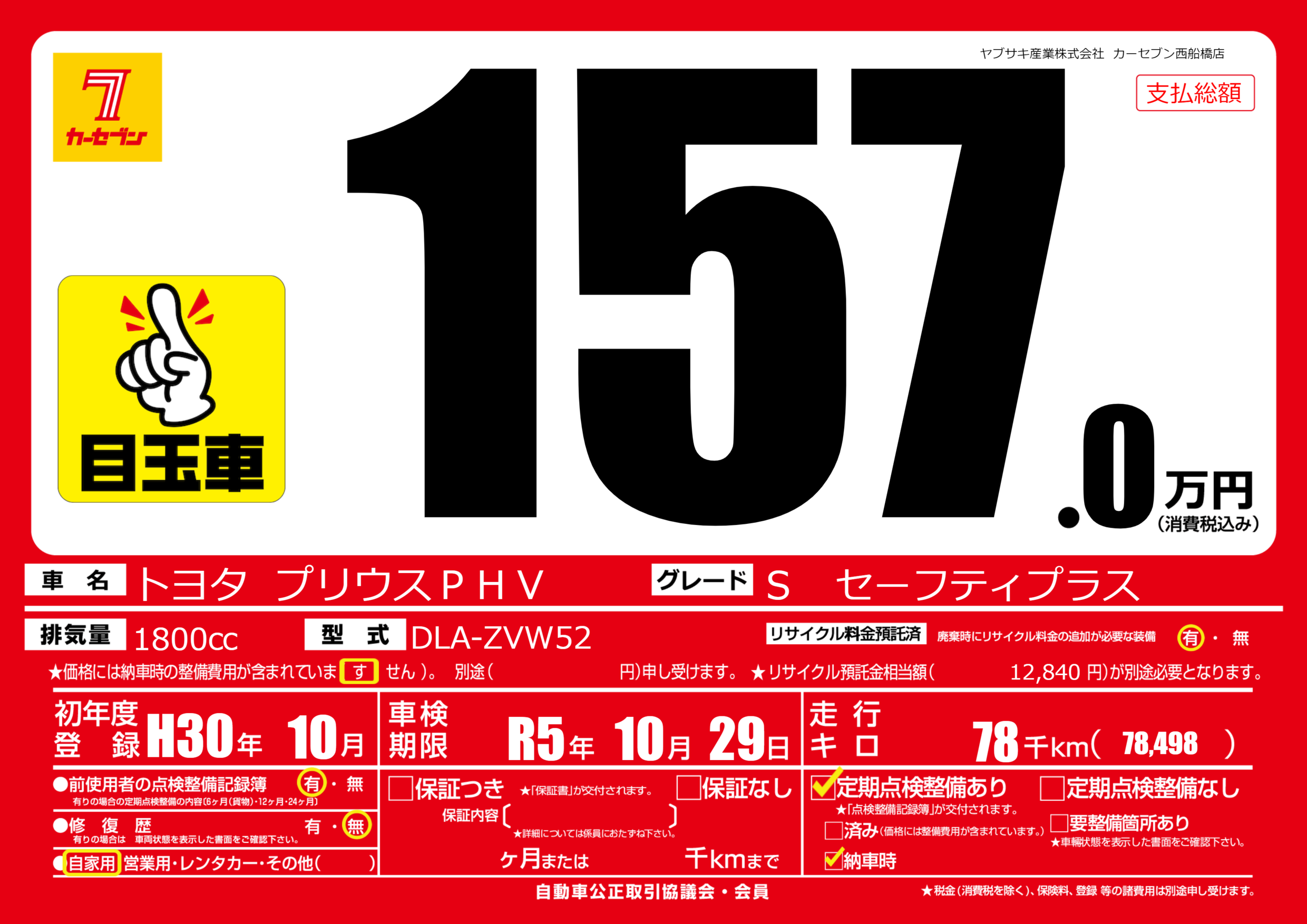 | 車名 | トヨタ プリウスPHV | グレード ミッション 排気量 |