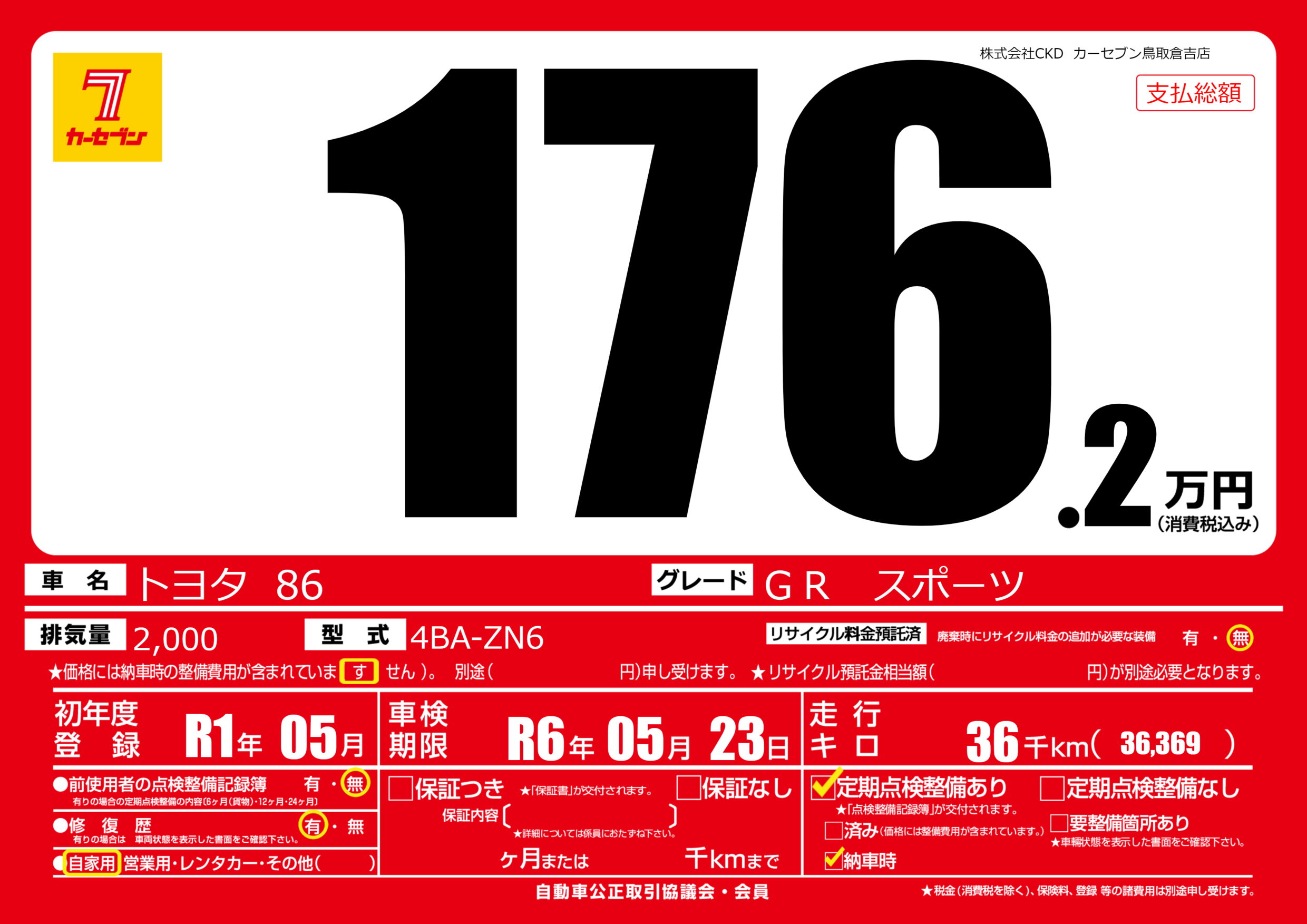 | 車名 | トヨタ 86 | グレード ミッション 排気量 |