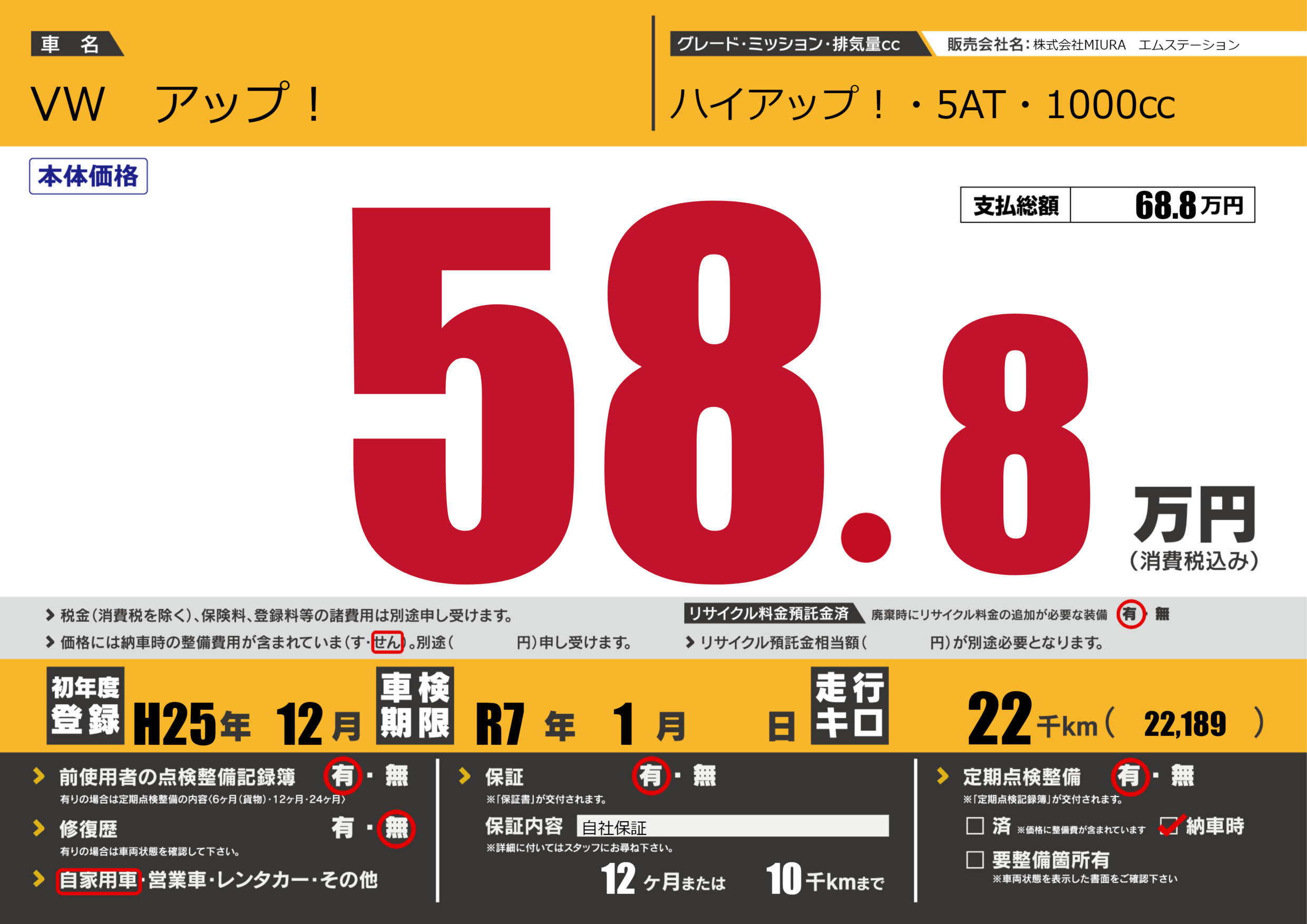 | 車名 | VW アップ! | グレード ミッション 排気量 |