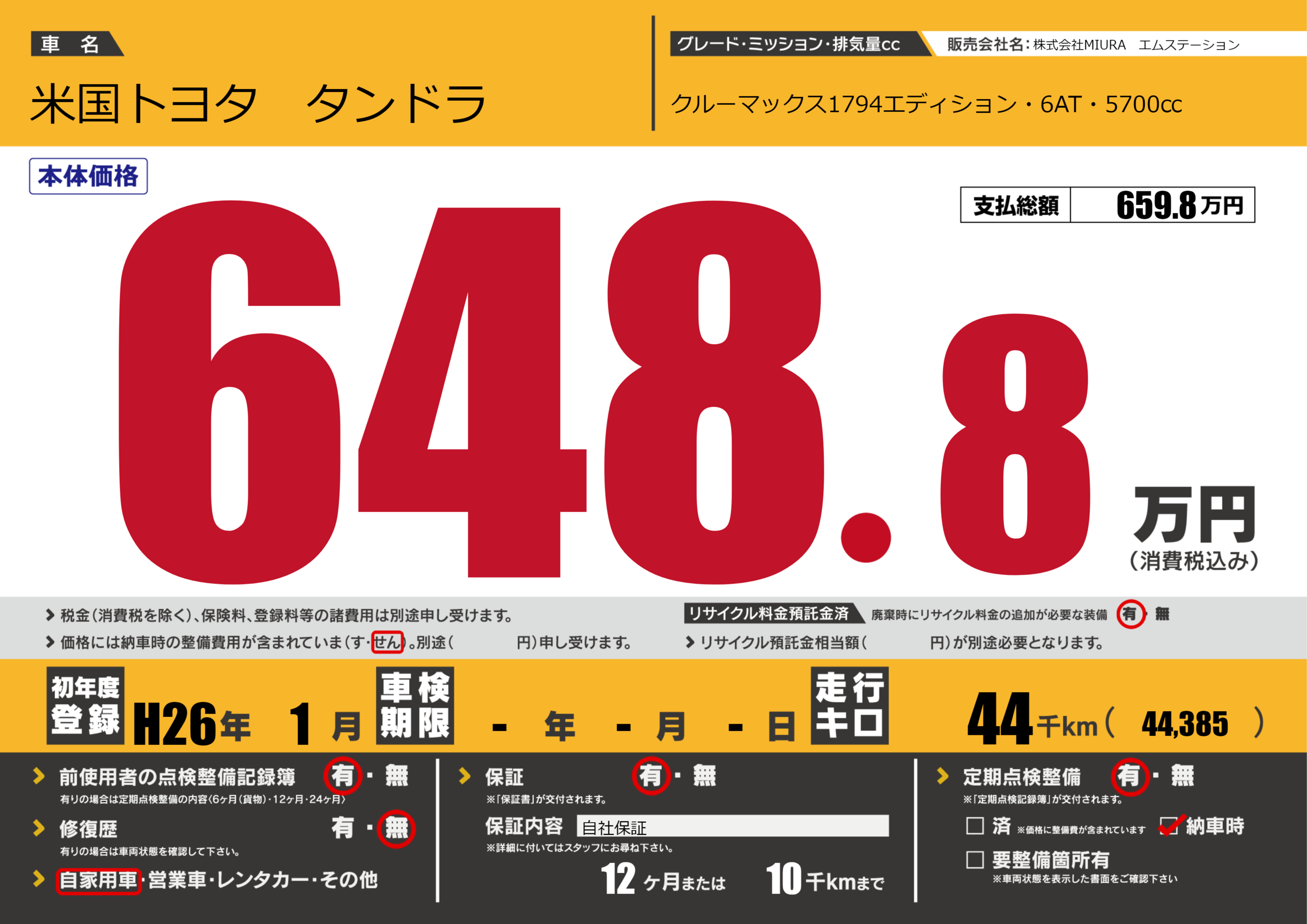 | 車名 | 米国トヨタ タンドラ | グレード ミッション 排気量 |
