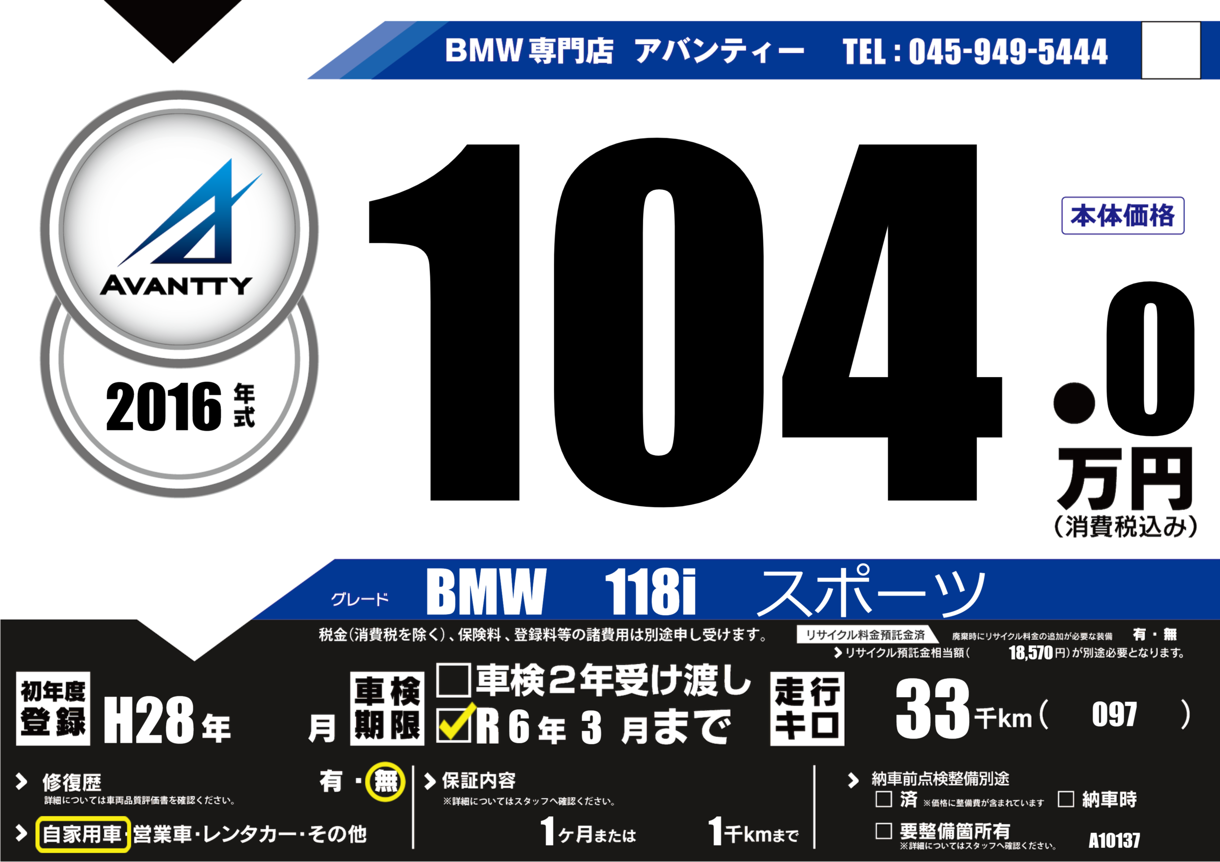 | 走行キロ | 3.3万km | 初年度登録 | H28年---月 |