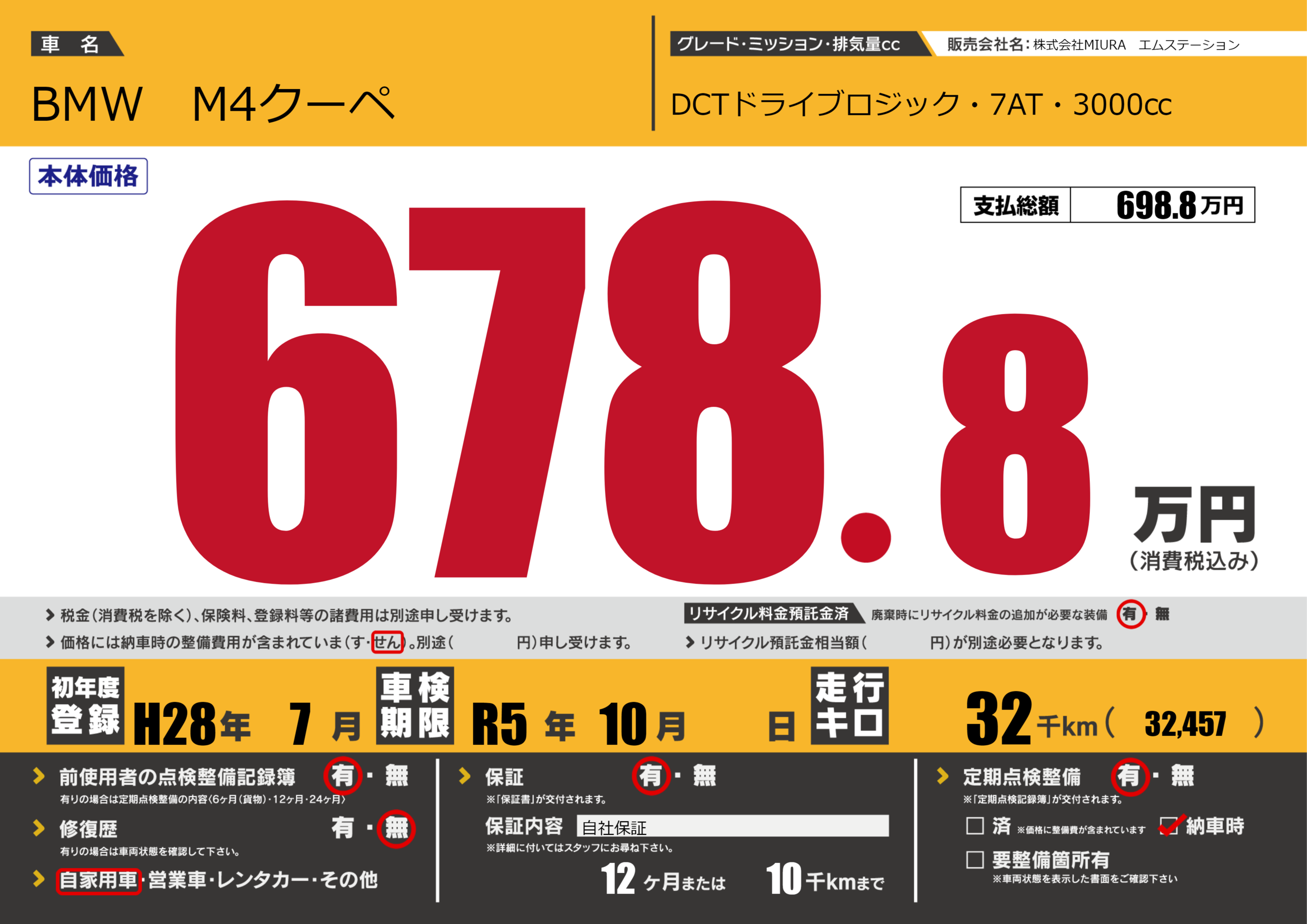 | 車名 | BMW M4クーペ | グレード ミッション 排気量 |