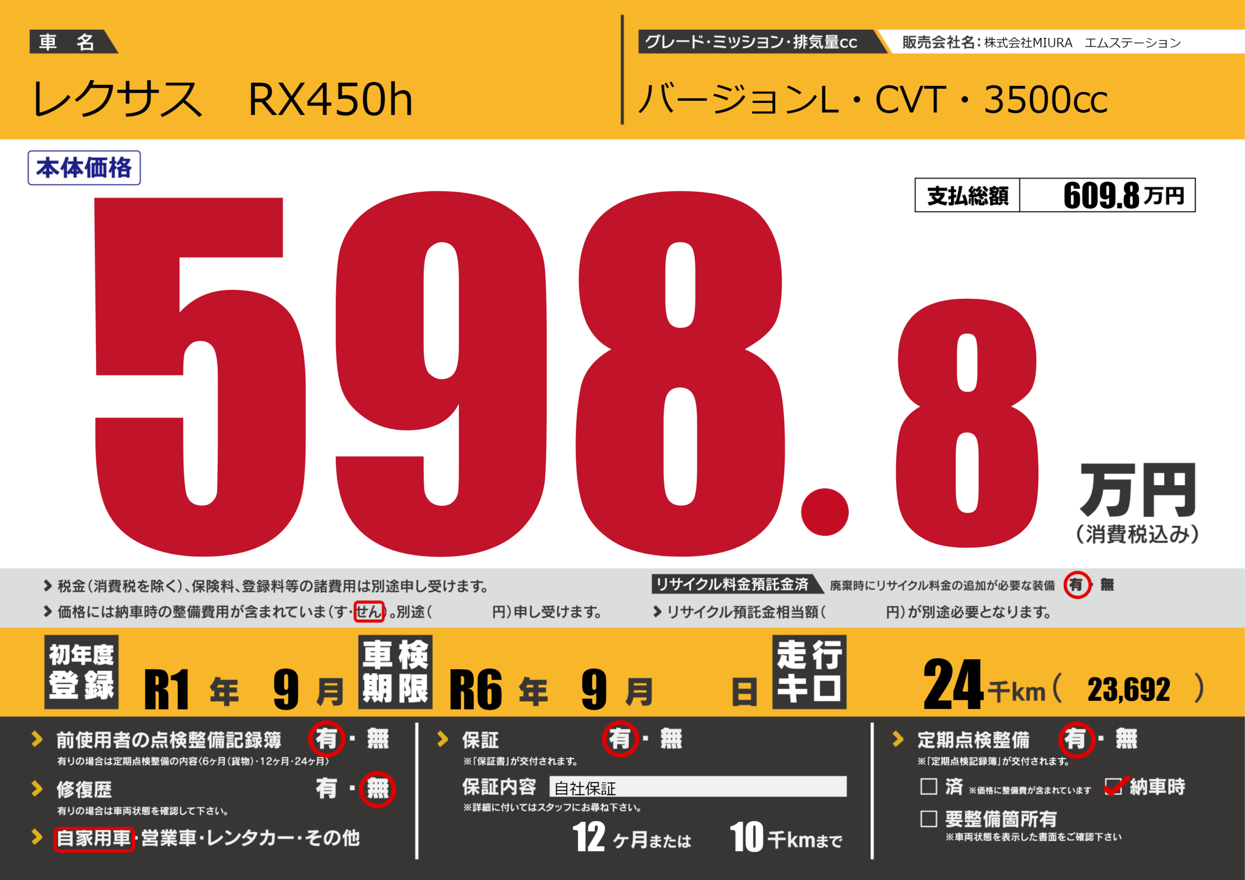 | 車名 | レクサス RX450h | グレード ミッション 排気量 |