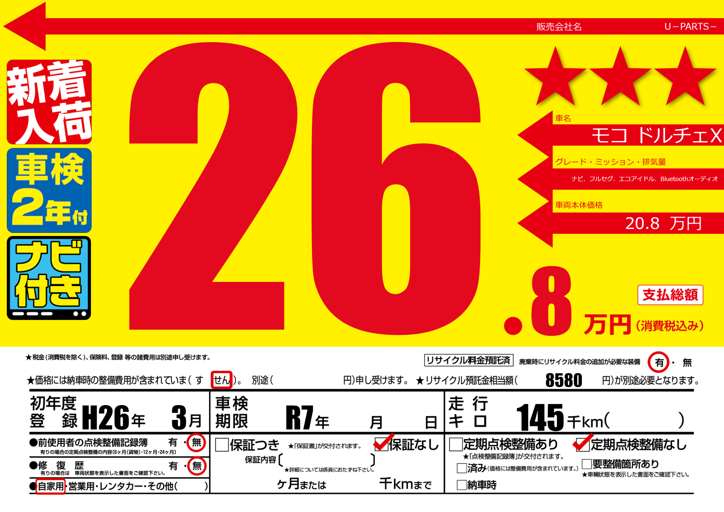 | 走行キロ | 14.5万km | 初年度登録 | H26年3月 |