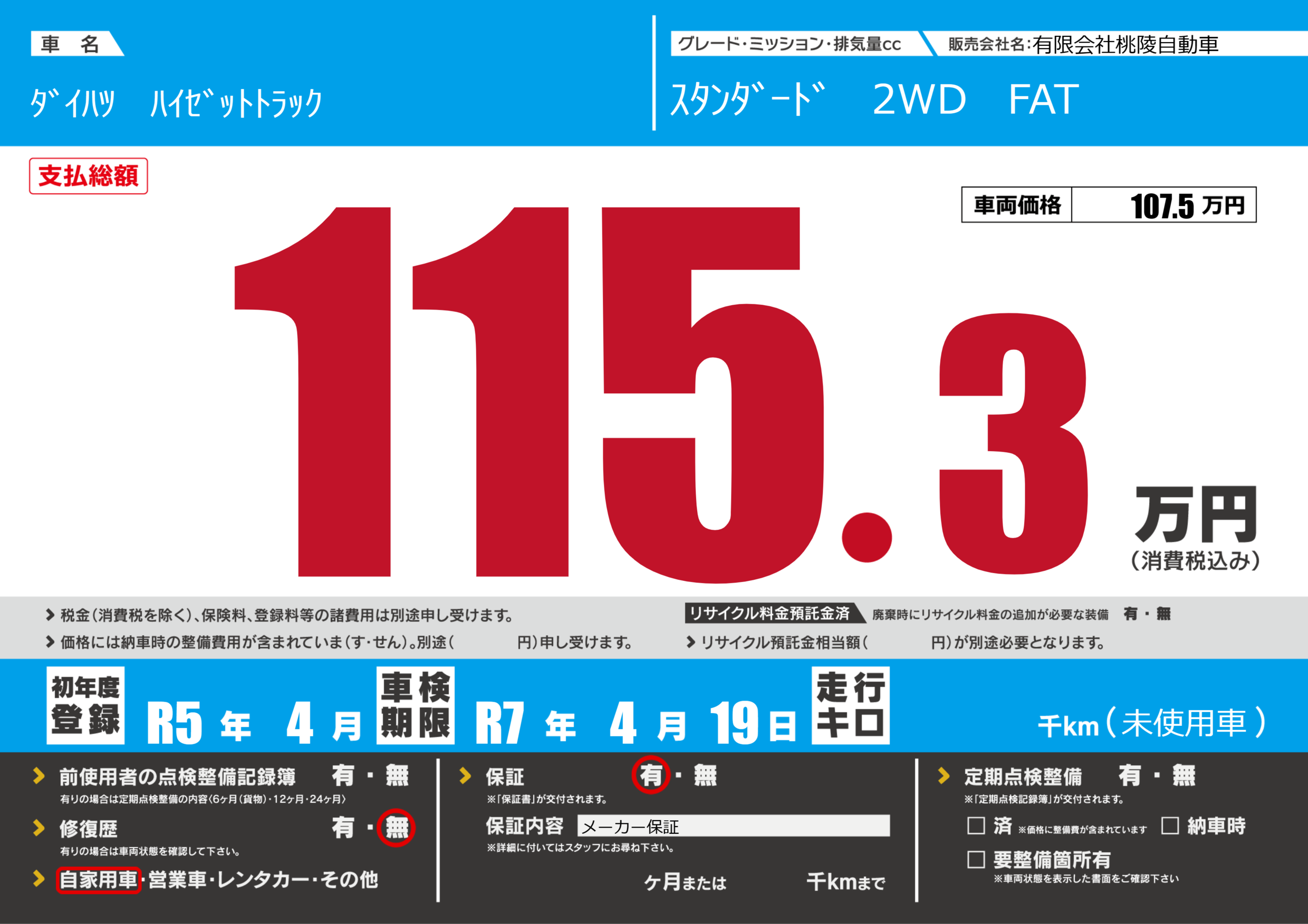 保証付き 保証内容(メーカー保証) ---ヶ月または()千kmまで |