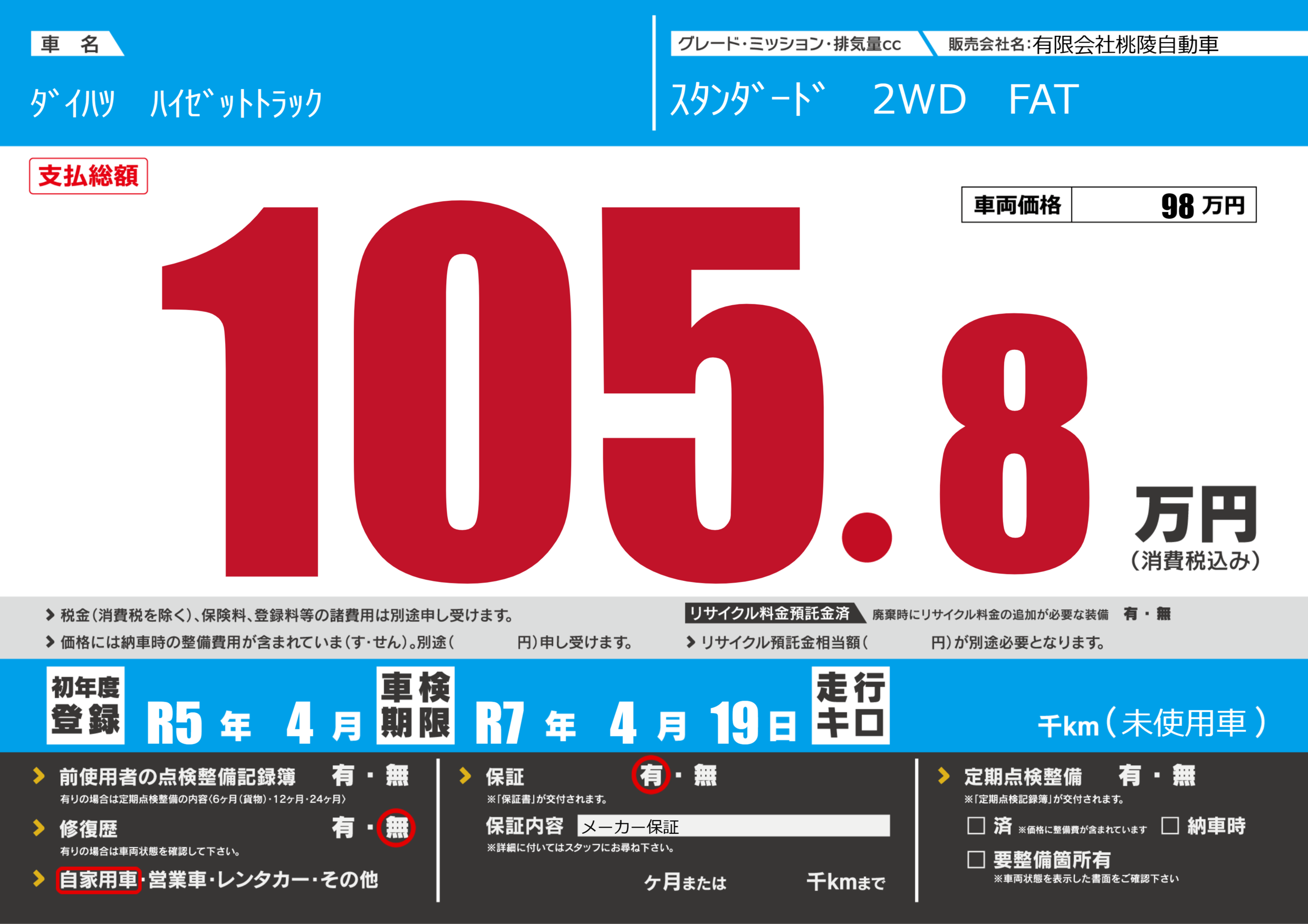保証付き 保証内容(メーカー保証) ---ヶ月または()千kmまで |
