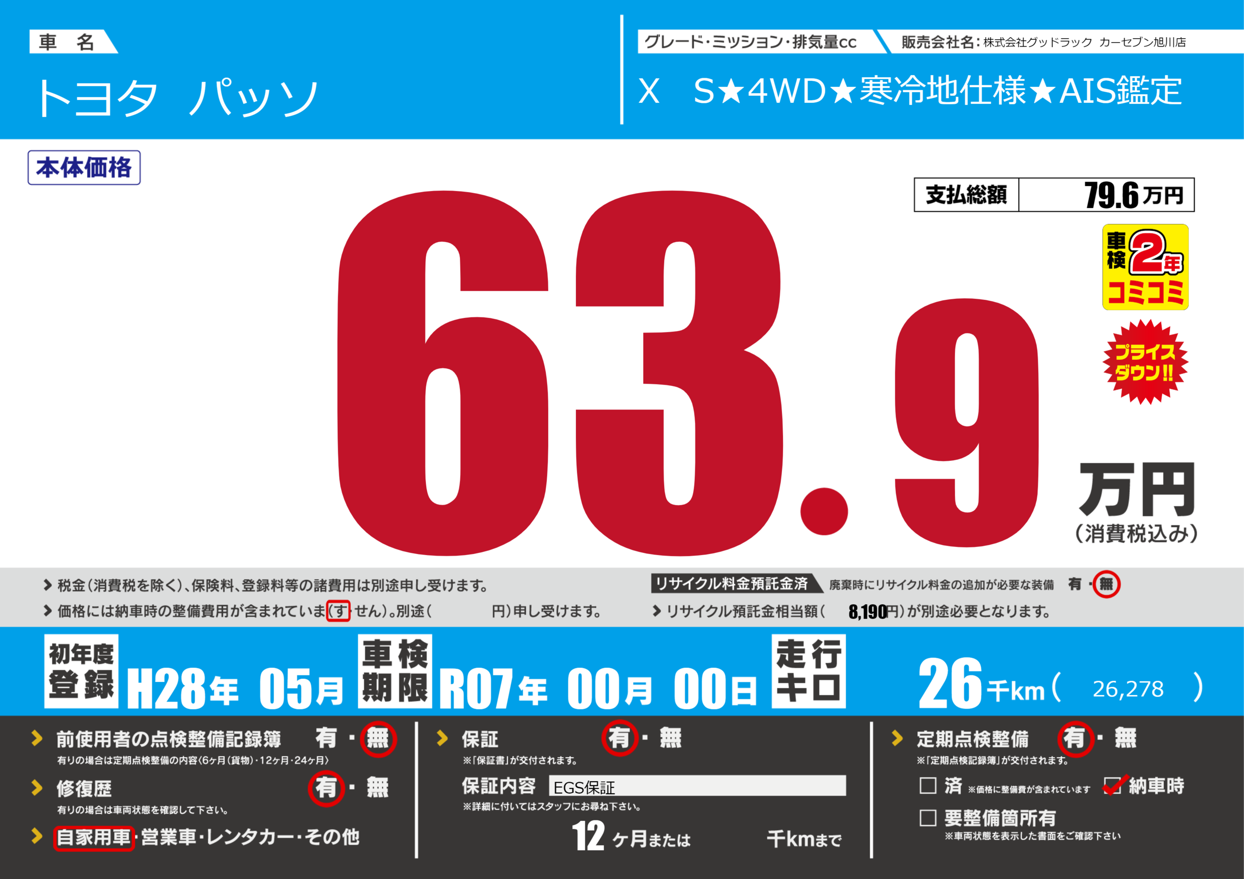 | 車名 | トヨタ パッソ | グレード ミッション 排気量 |