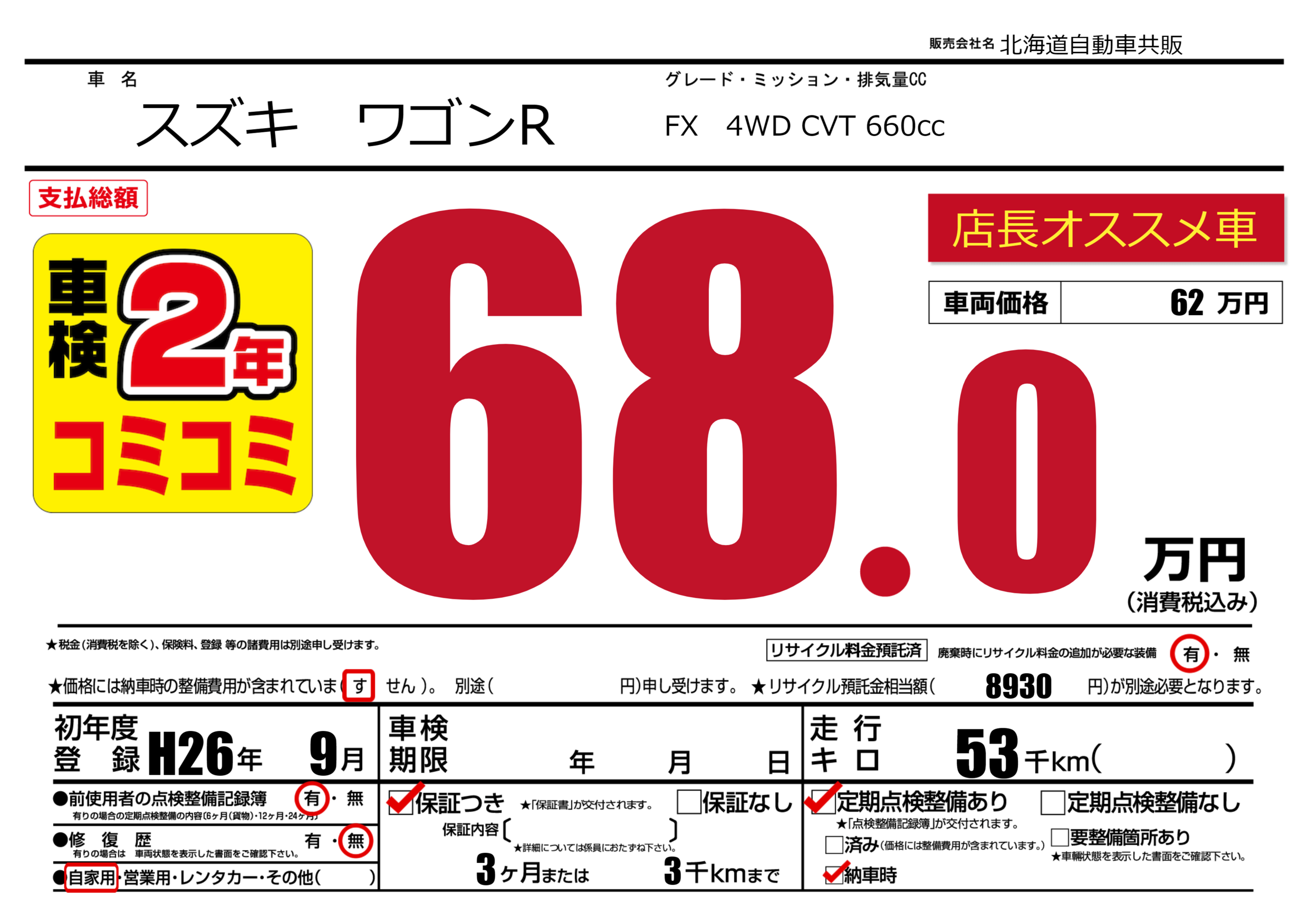 | 走行キロ | 5.3万km | 初年度登録 | H26年9月 |