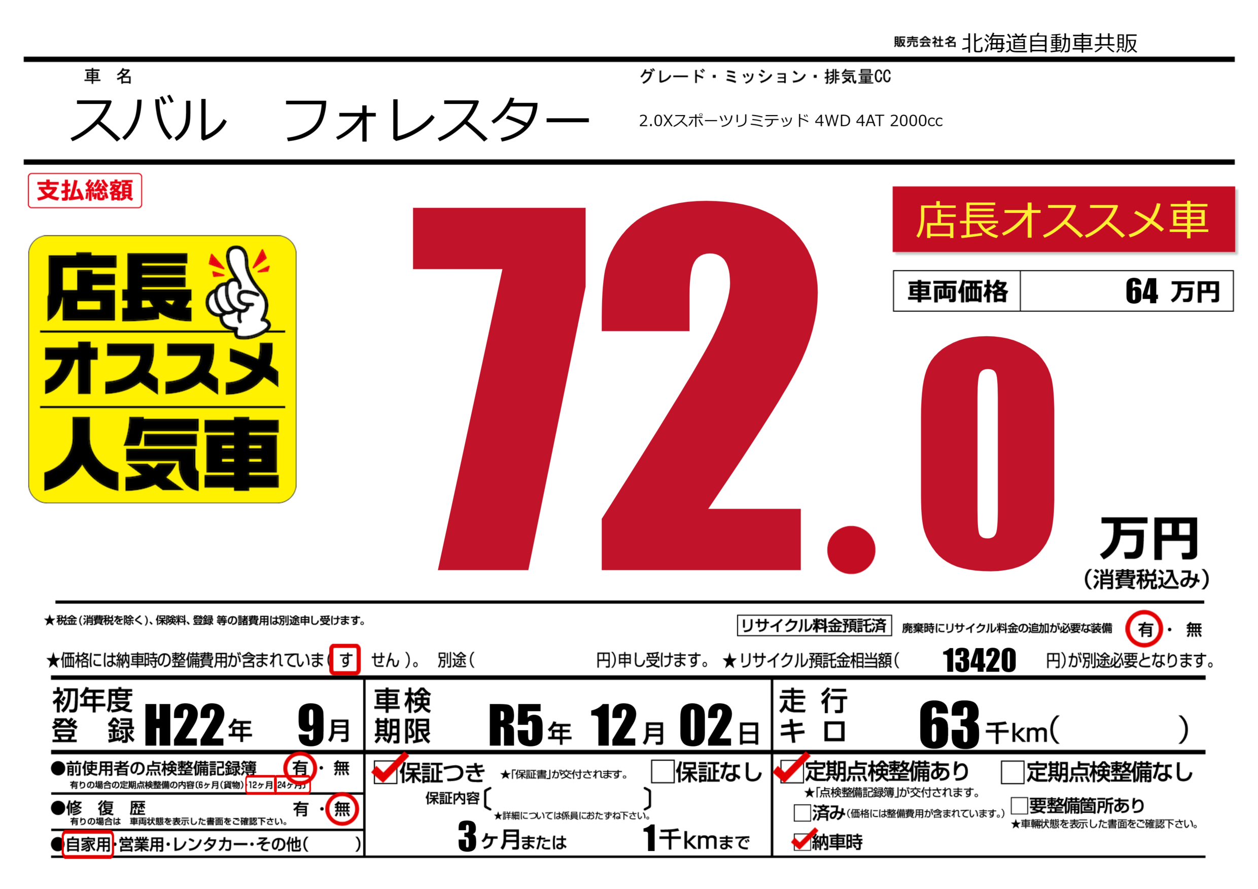 | 車名 | スバル フォレスター | グレード ミッション 排気量 |