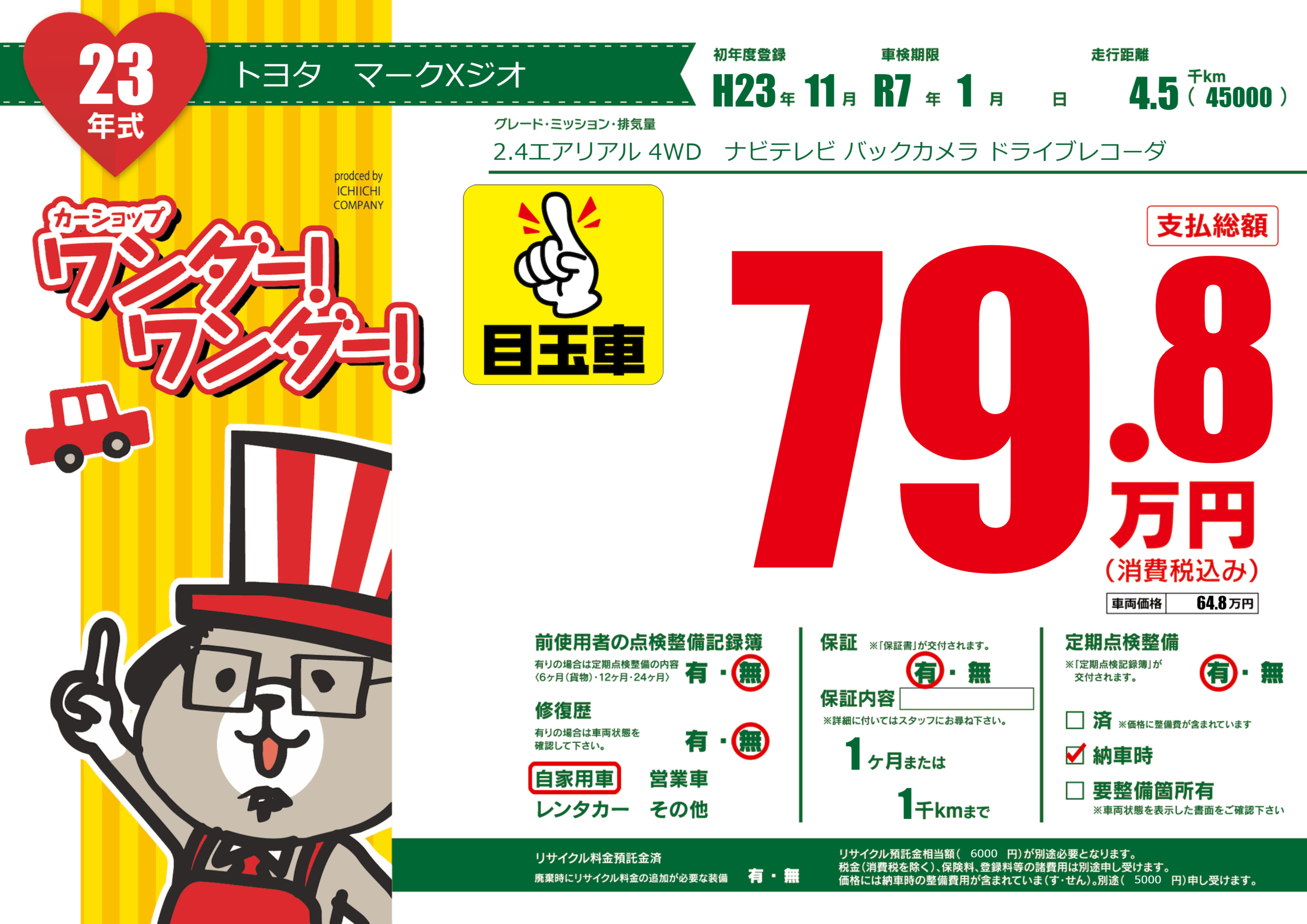 | 定期点検整備 | 定期点検整備あり 納車時あり | ||