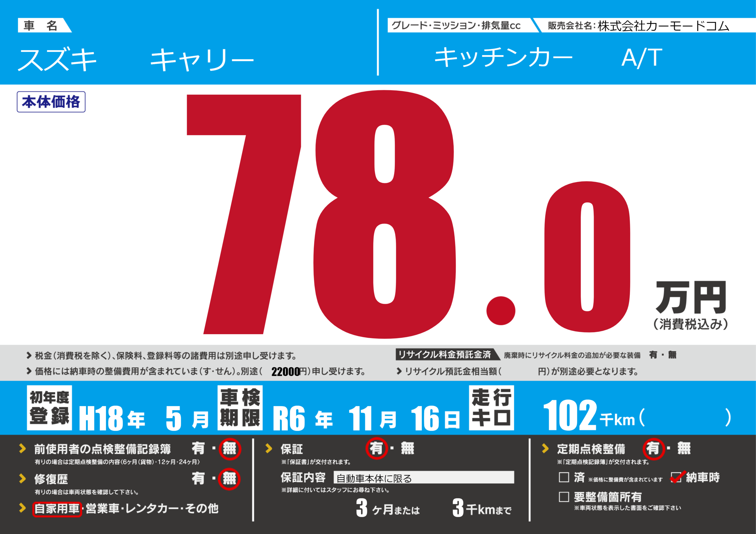 | 車名 | スズキ キャリー | グレード ミッション 排気量 |