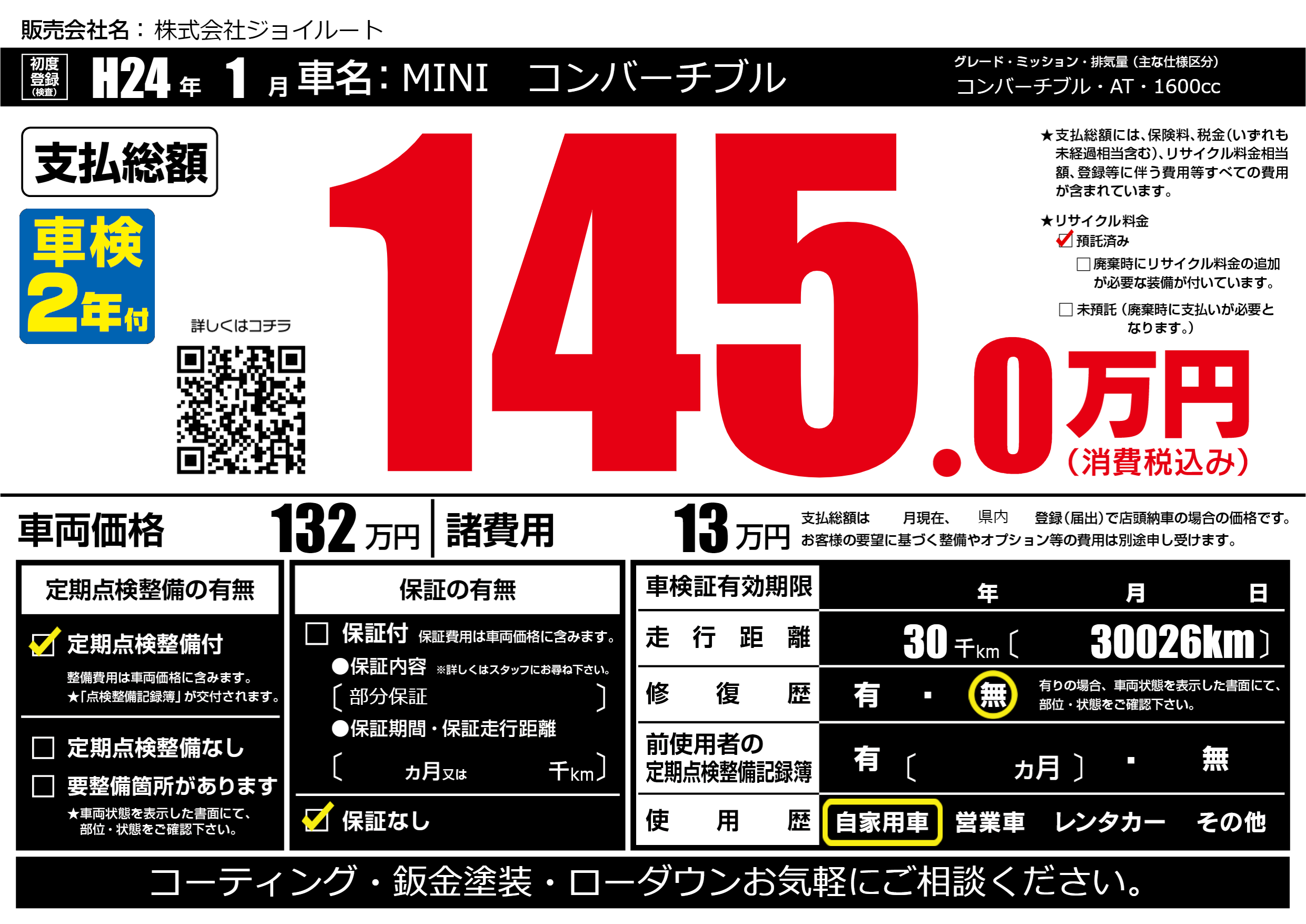 | 車名 | MINI コンバーチブル | グレード ミッション 排気量 |