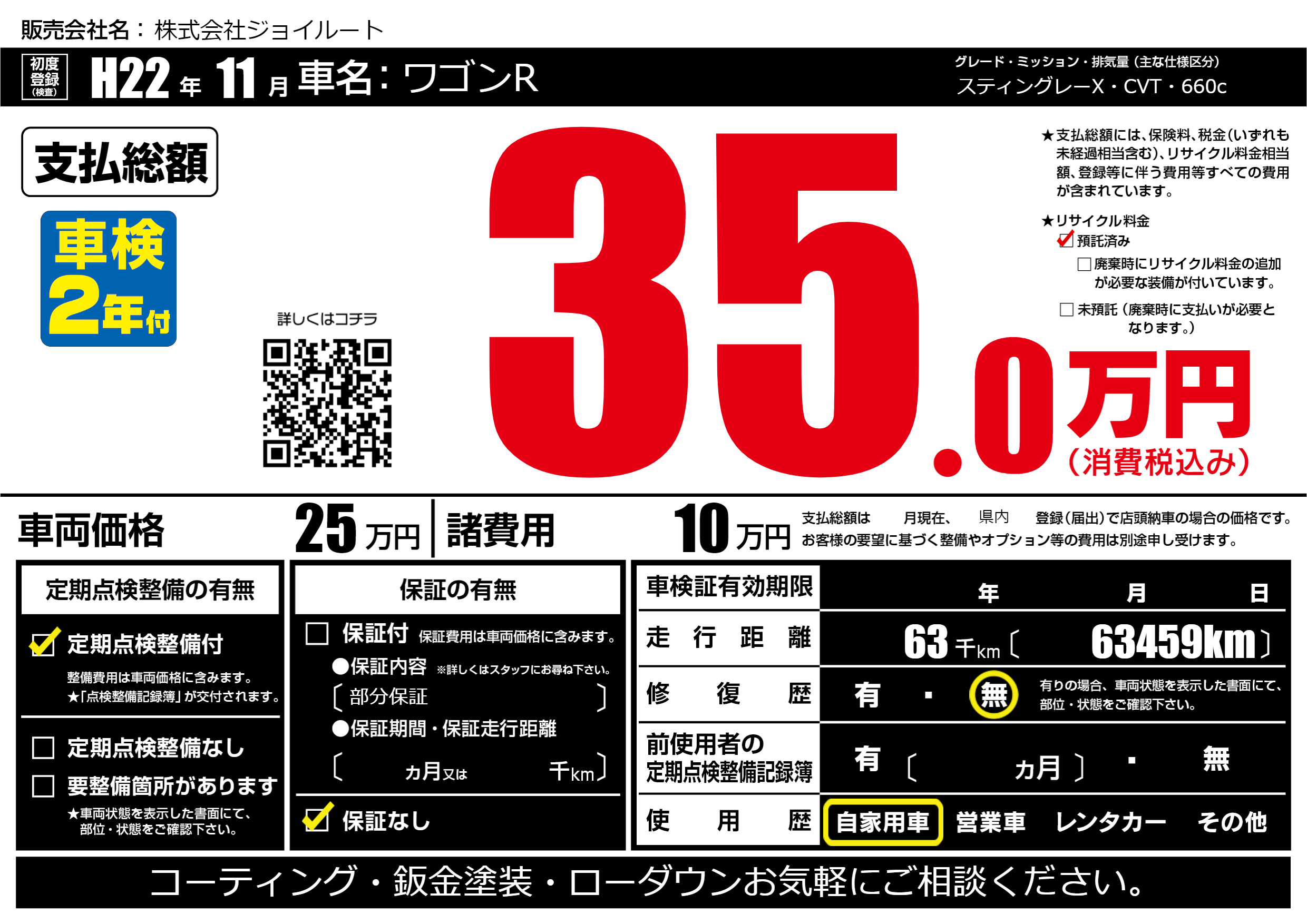 | 走行キロ | 6.3万km | 初年度登録 | H22年11月 |