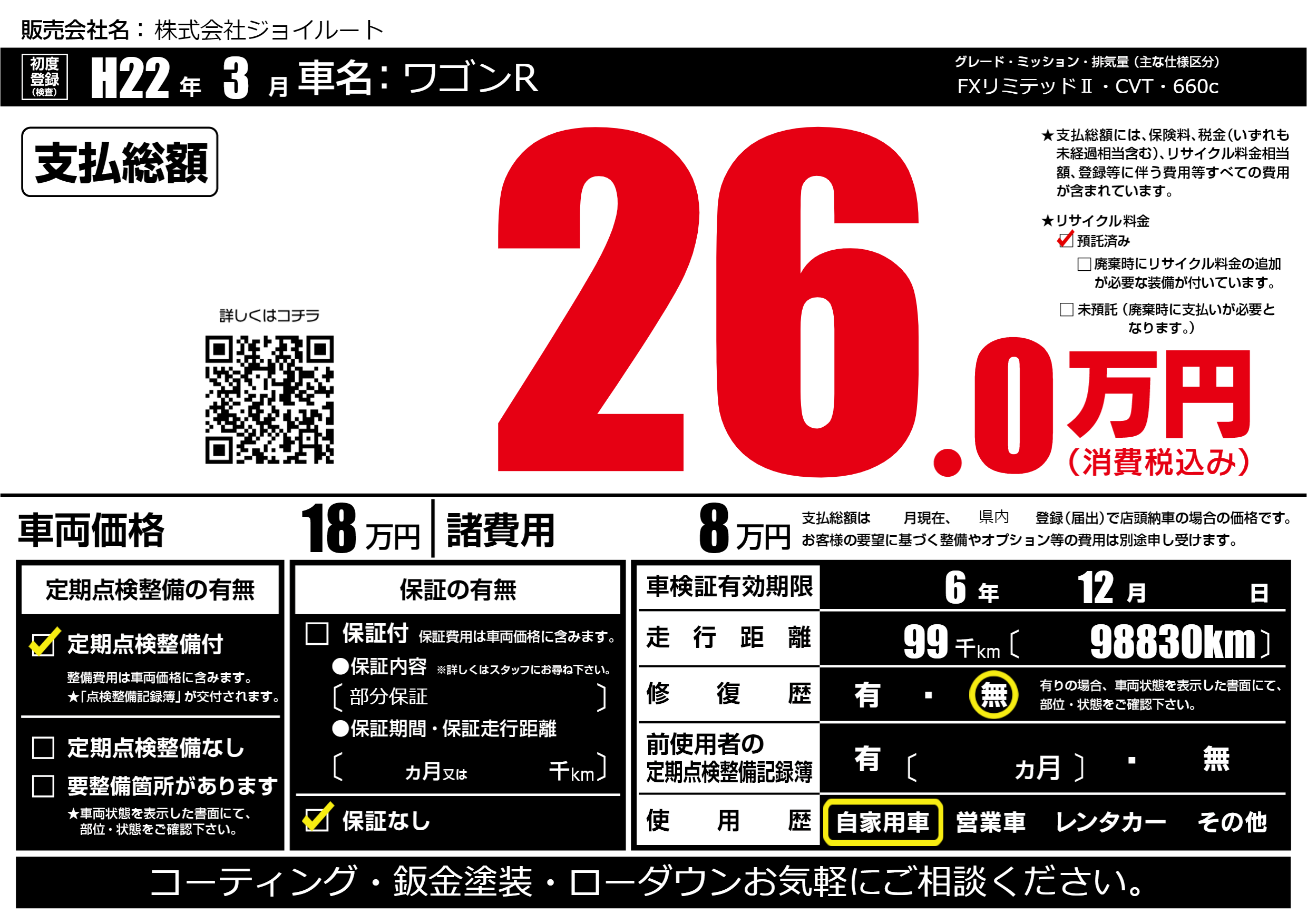 | 車名 | ワゴンR | グレード ミッション 排気量 |