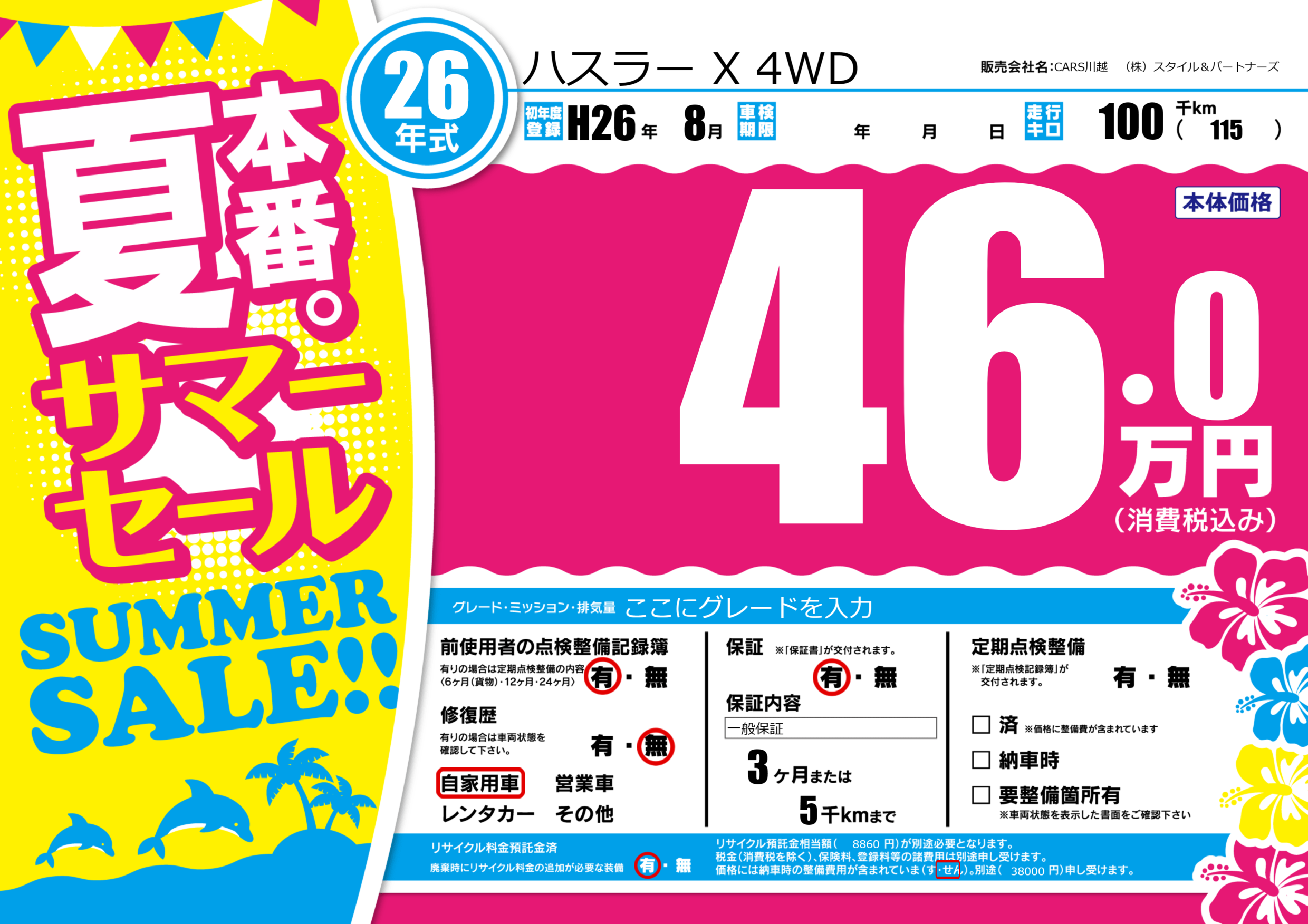 | 走行キロ | 10万km | 初年度登録 | H26年8月 |