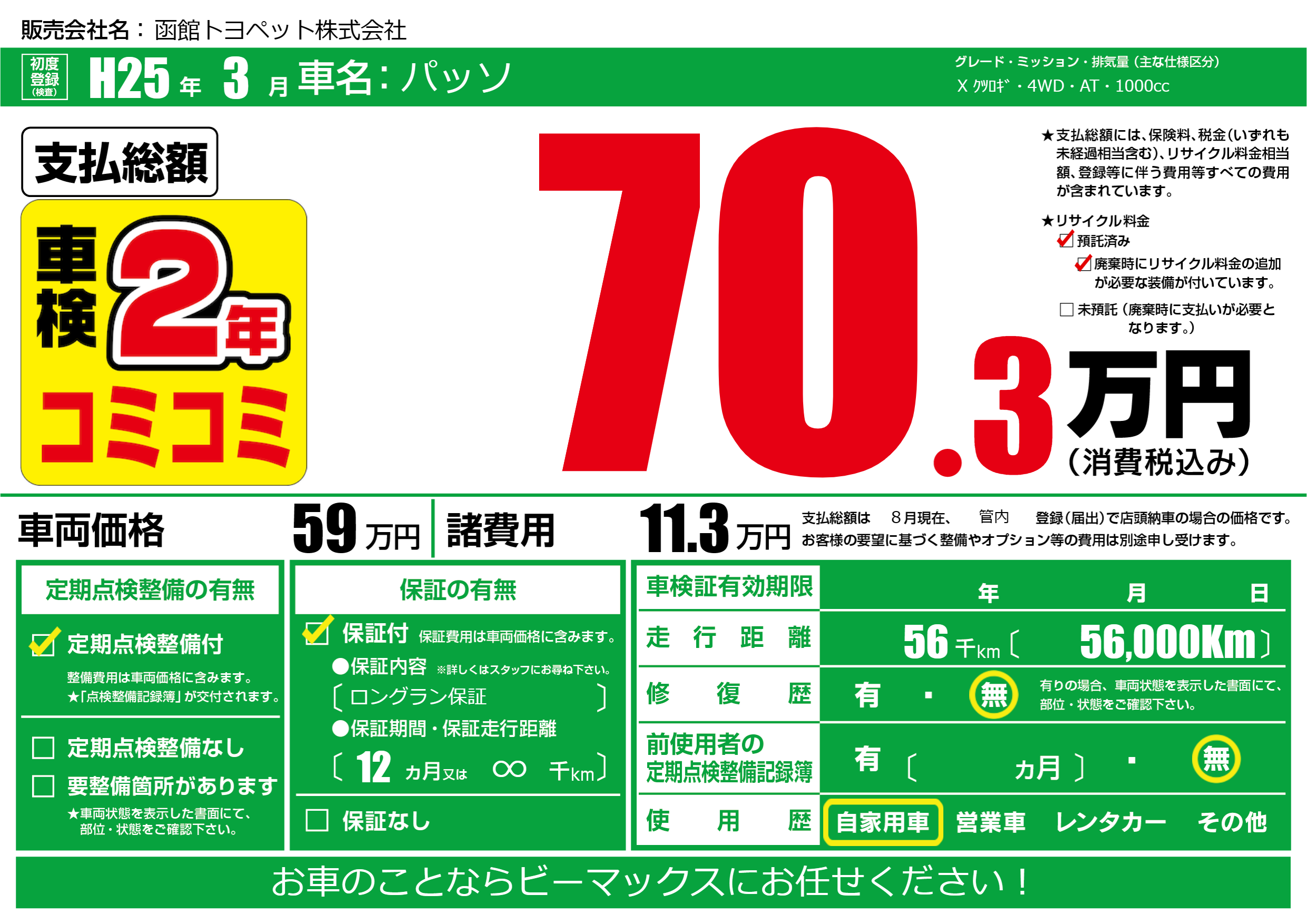 | 車名 | パッソ | グレード ミッション 排気量 |