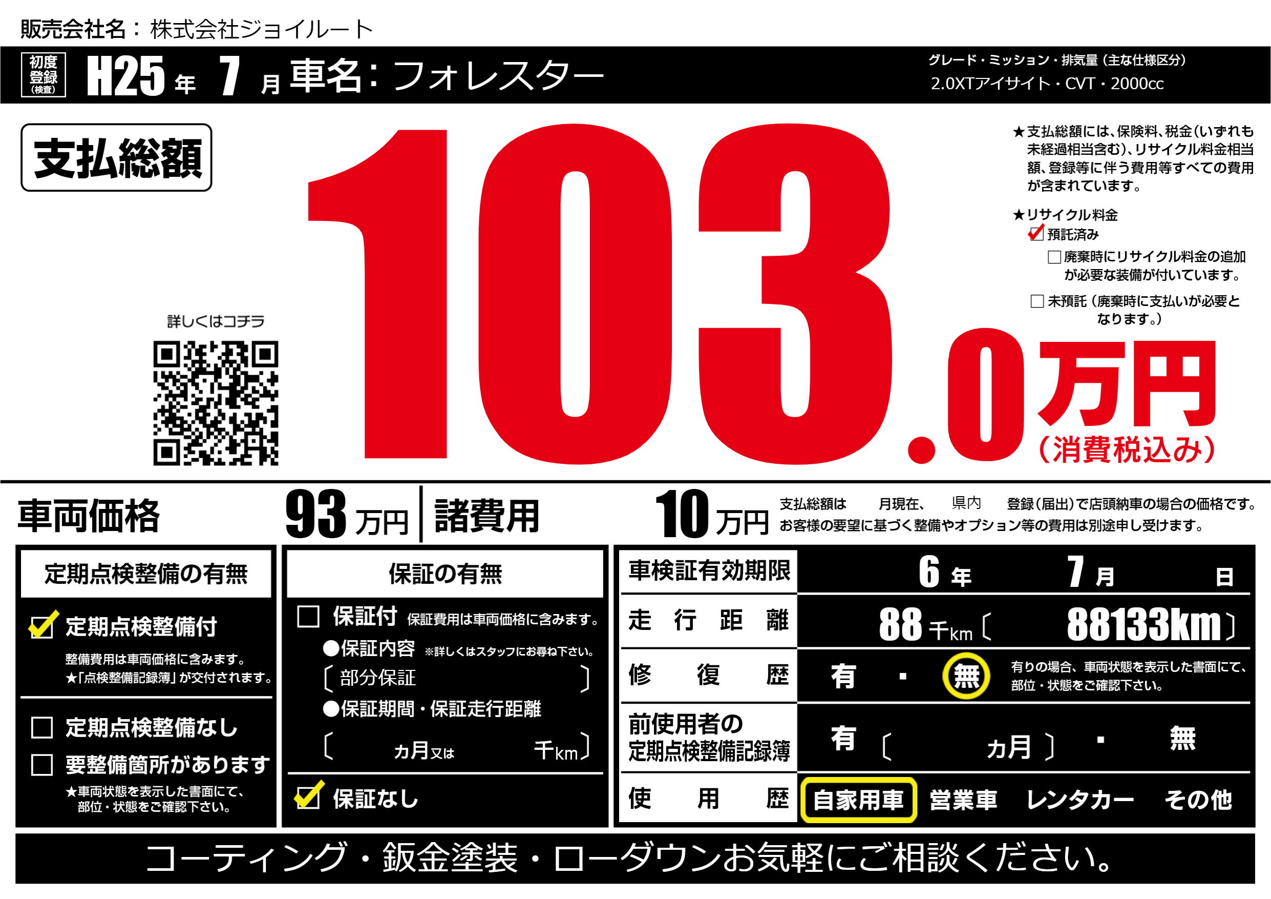 | 車名 | フォレスター | グレード ミッション 排気量 |