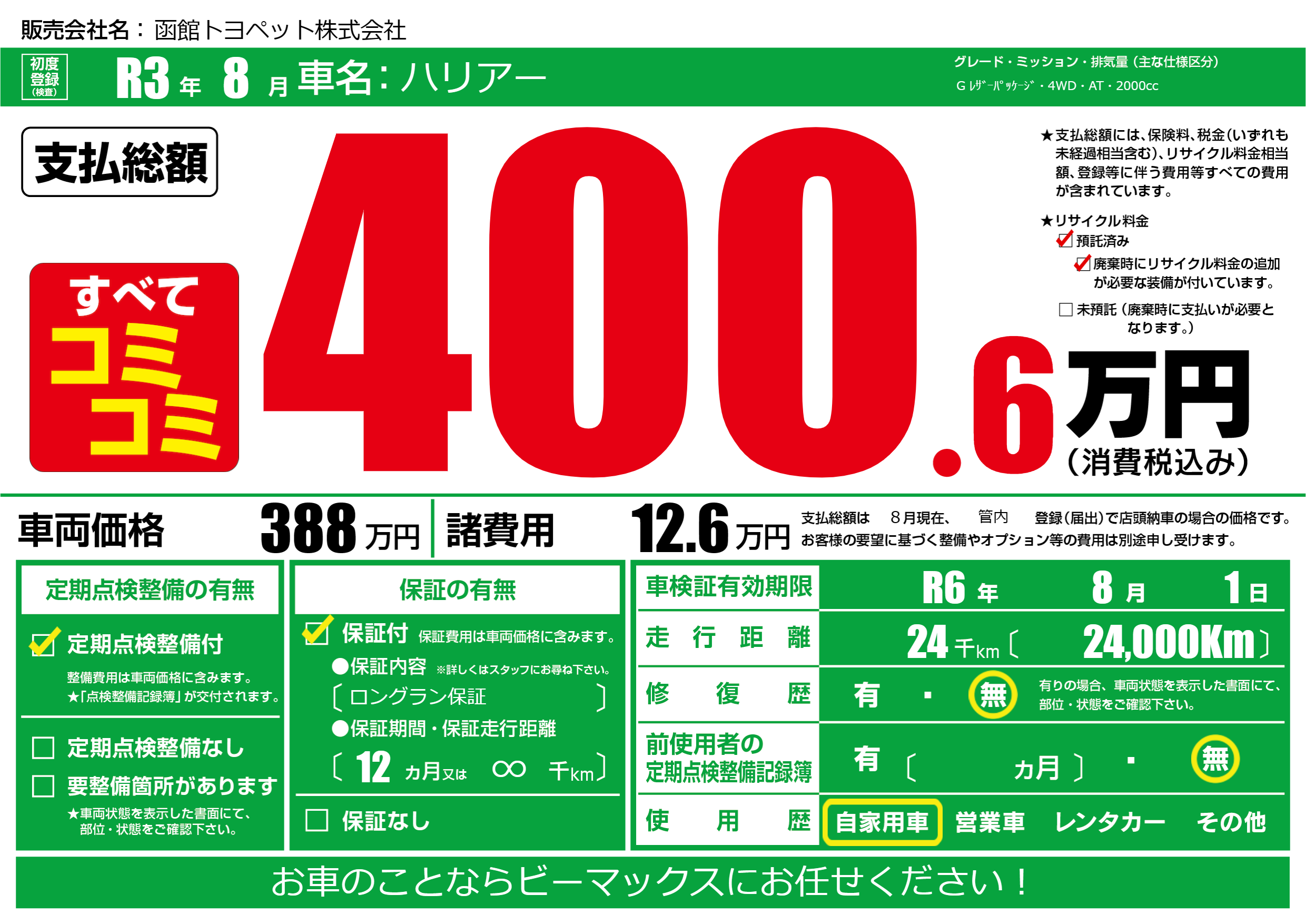| 走行キロ | 2.4万km | 初年度登録 | R3年8月 |