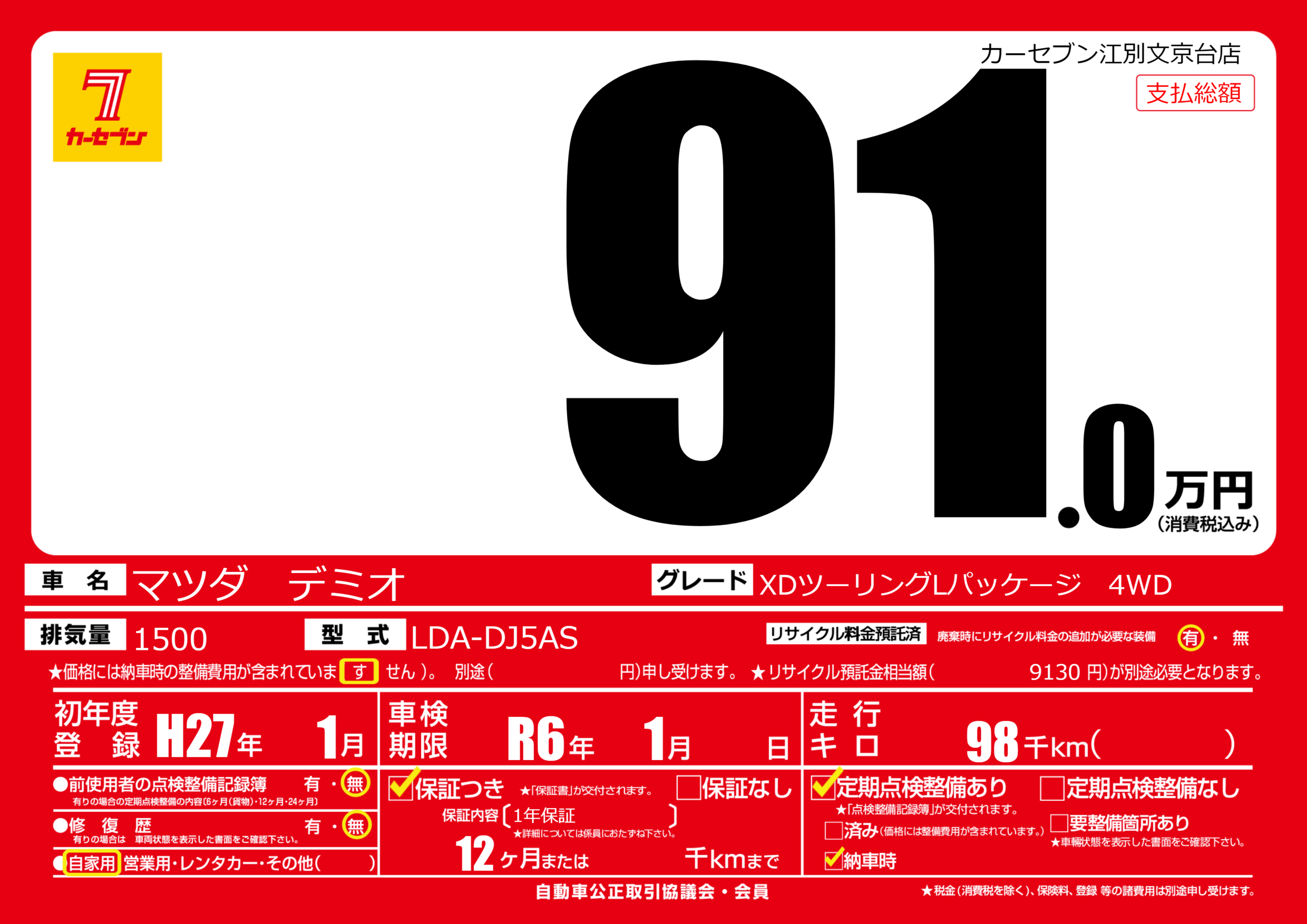 | 車名 | マツダ デミオ | グレード ミッション 排気量 |
