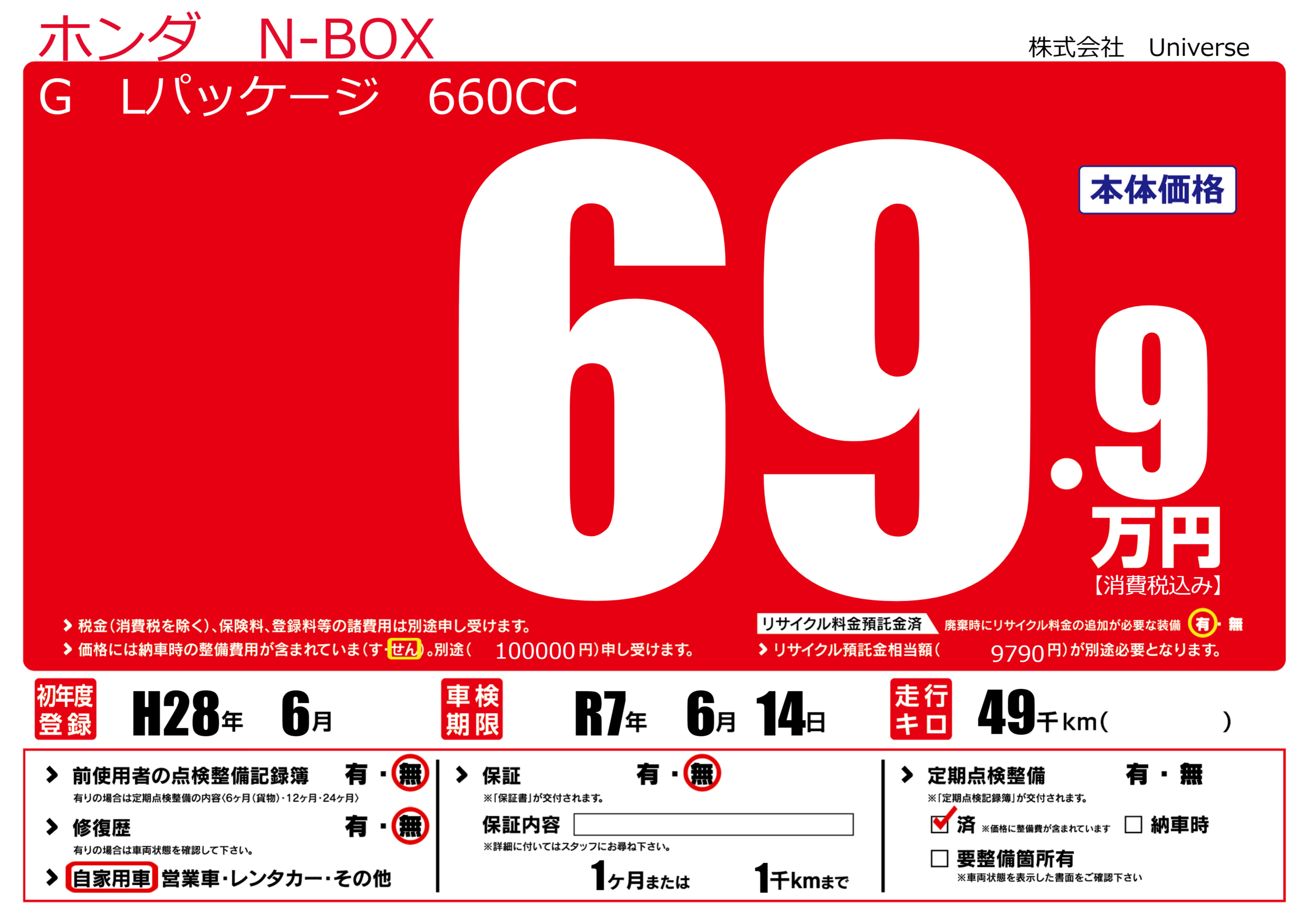 | 車名 | ホンダ N-BOX | グレード ミッション 排気量 |