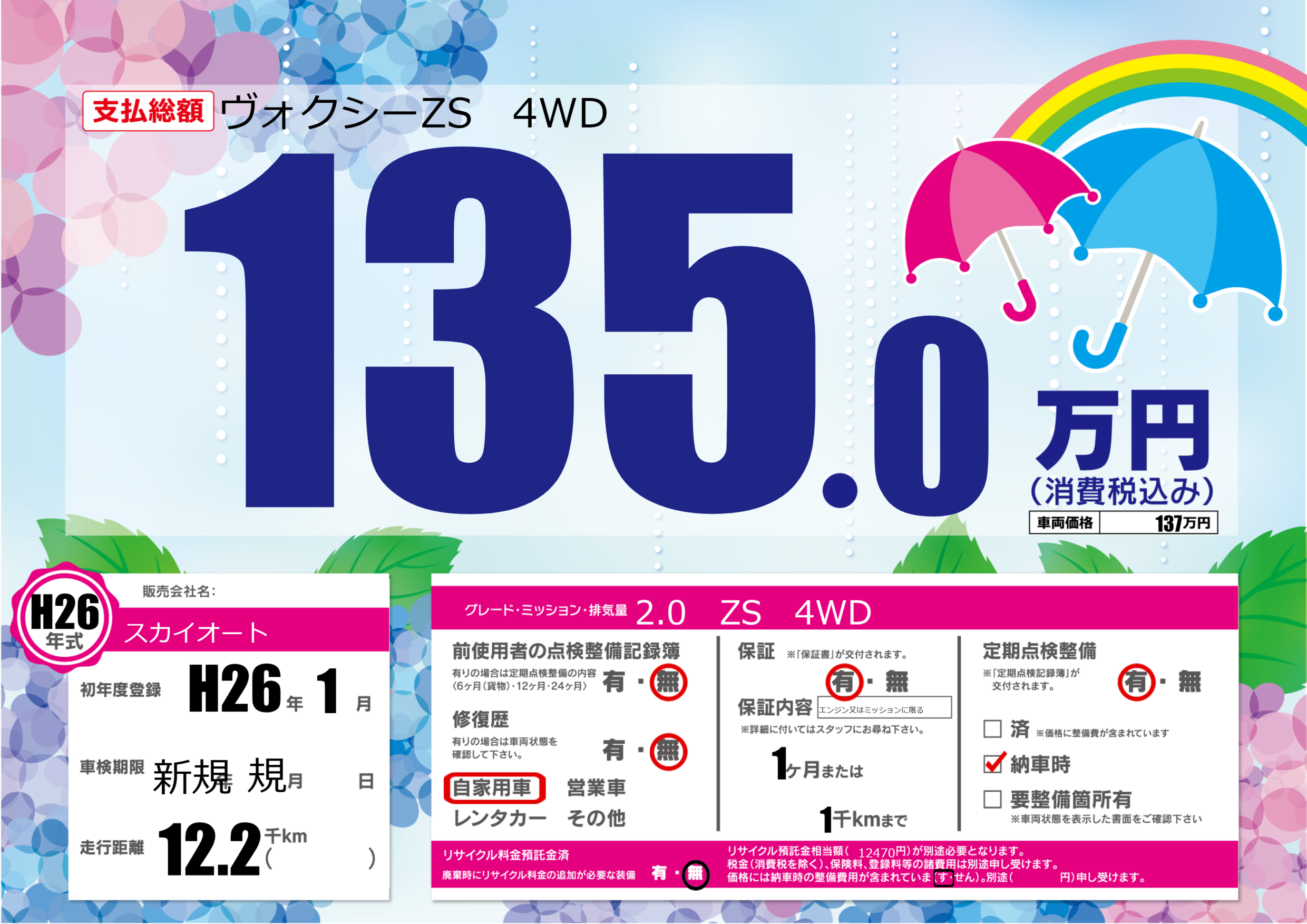 | 車名 | ヴォクシーZS 4WD | グレード ミッション 排気量 |