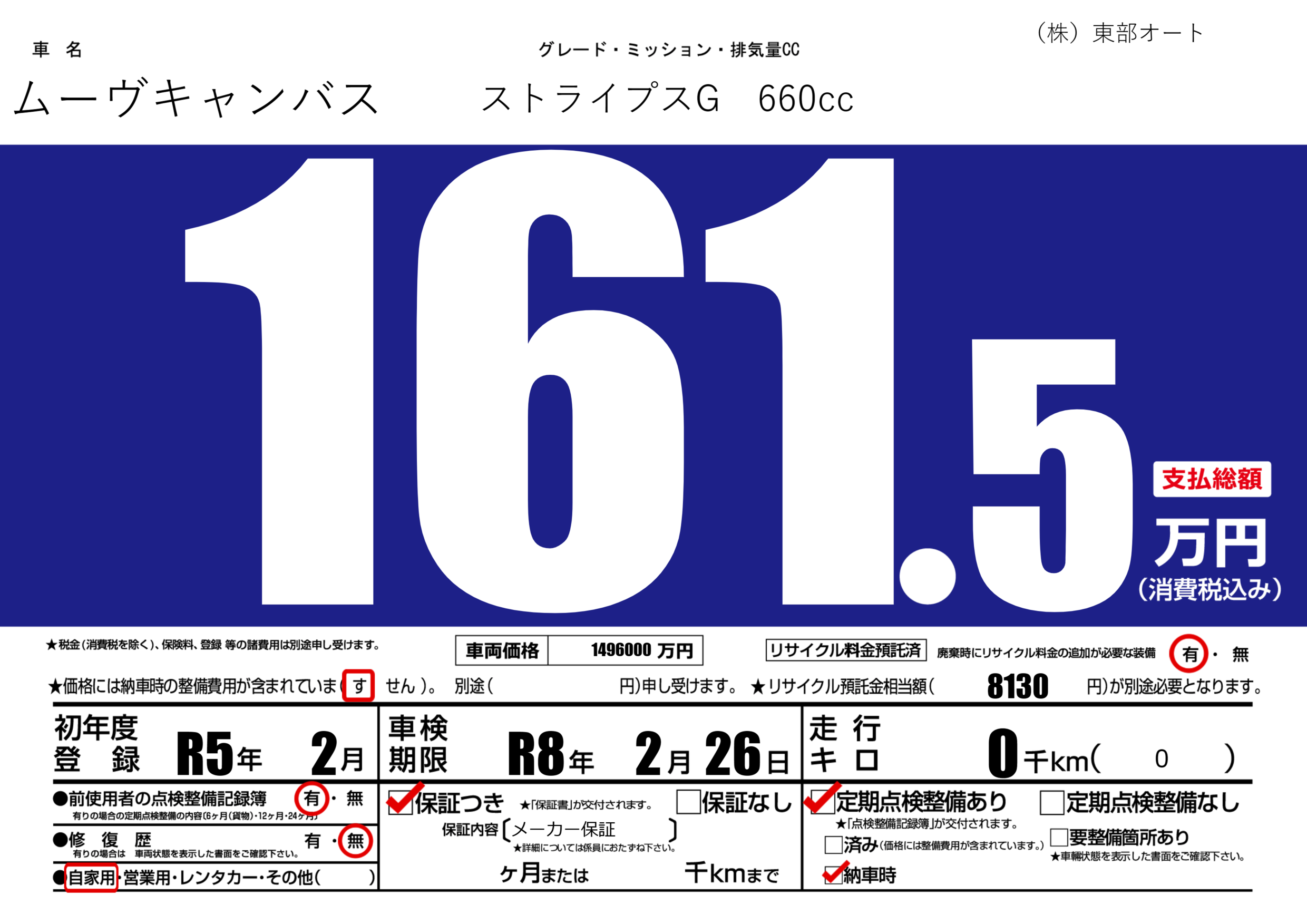 | 定期点検整備 | 定期点検整備あり 納車時あり | ||