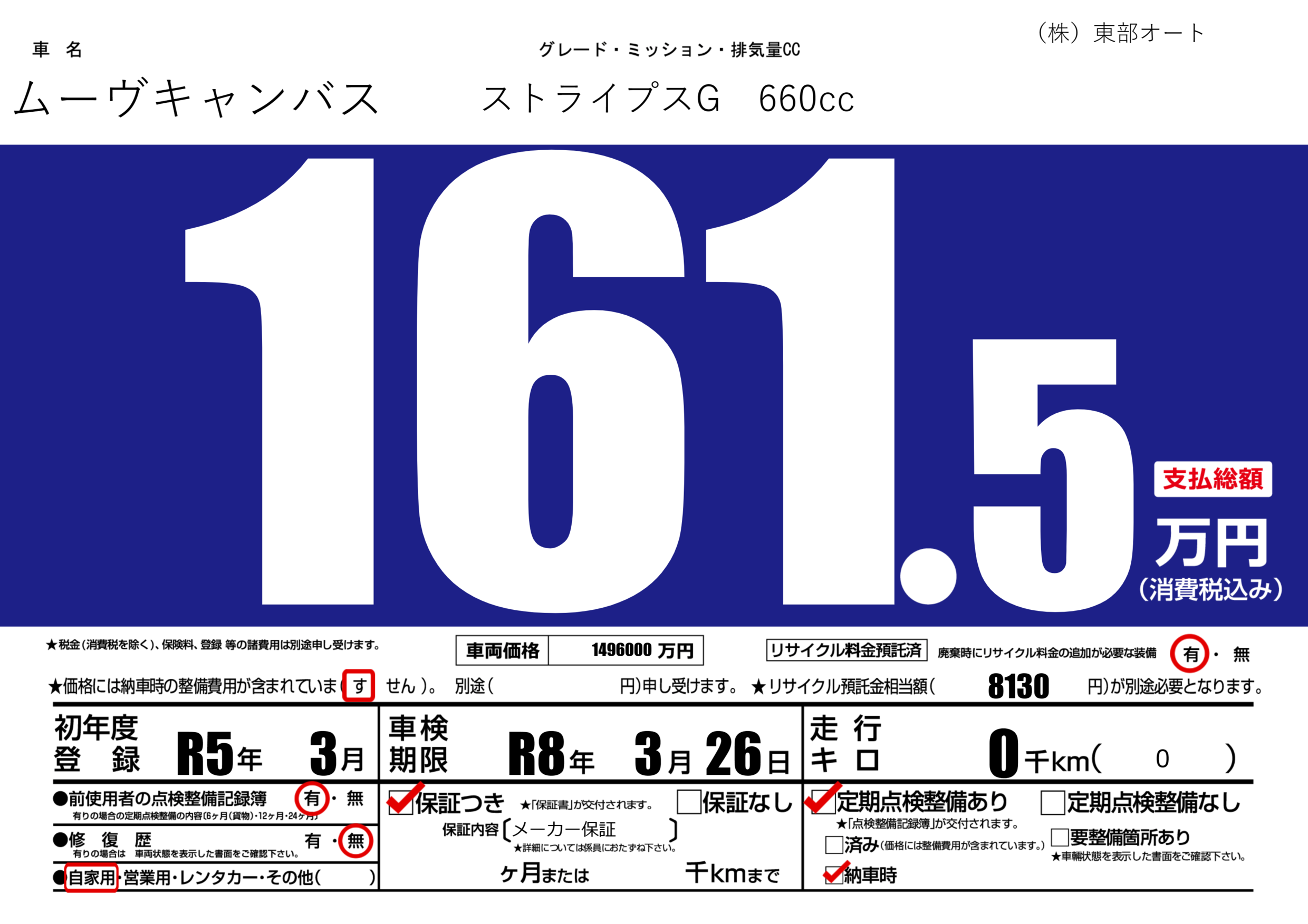 | 定期点検整備 | 定期点検整備あり 納車時あり | ||