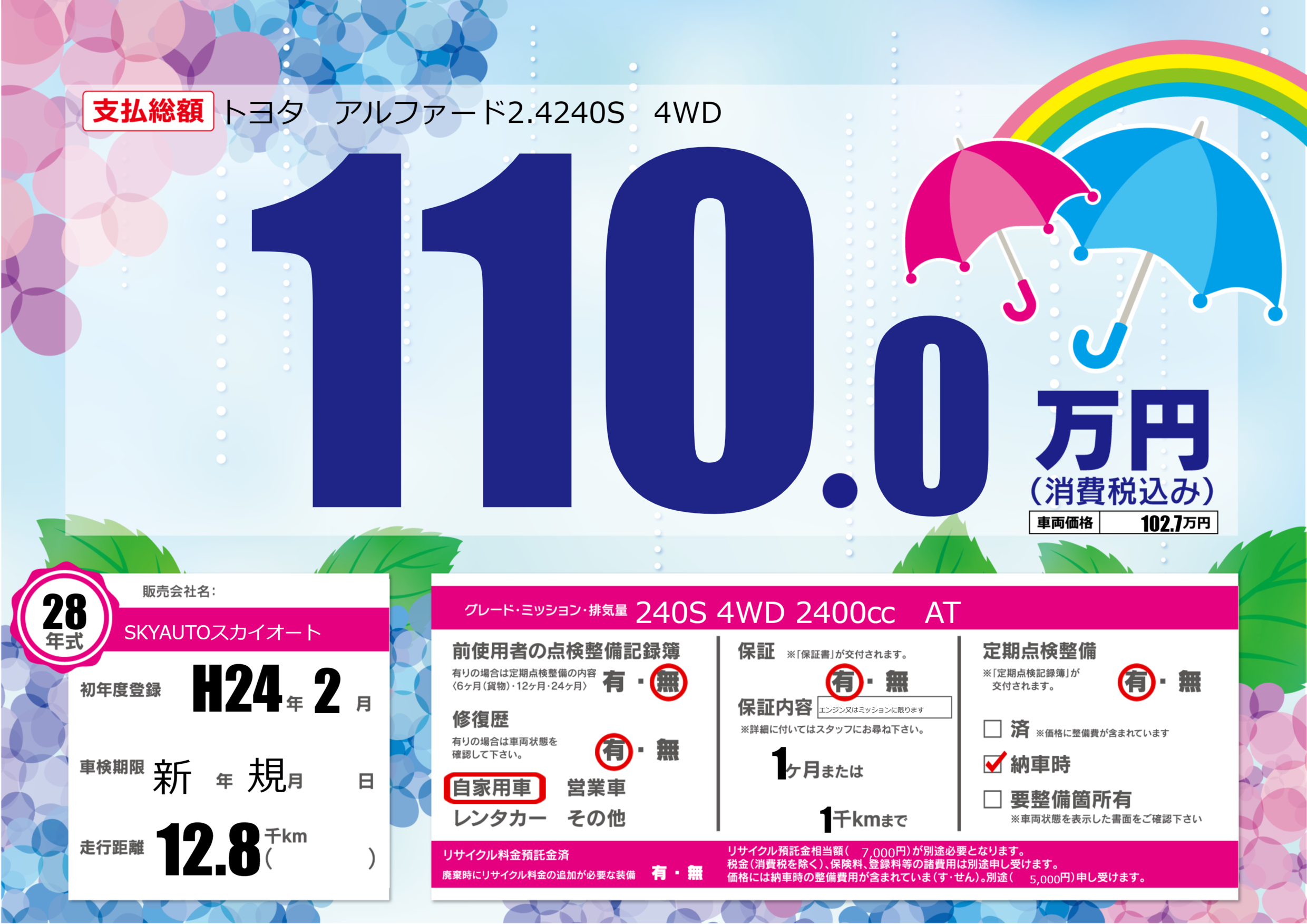 | 車名 | トヨタ アルファード2.4240S 4WD | グレード ミッション 排気量 |