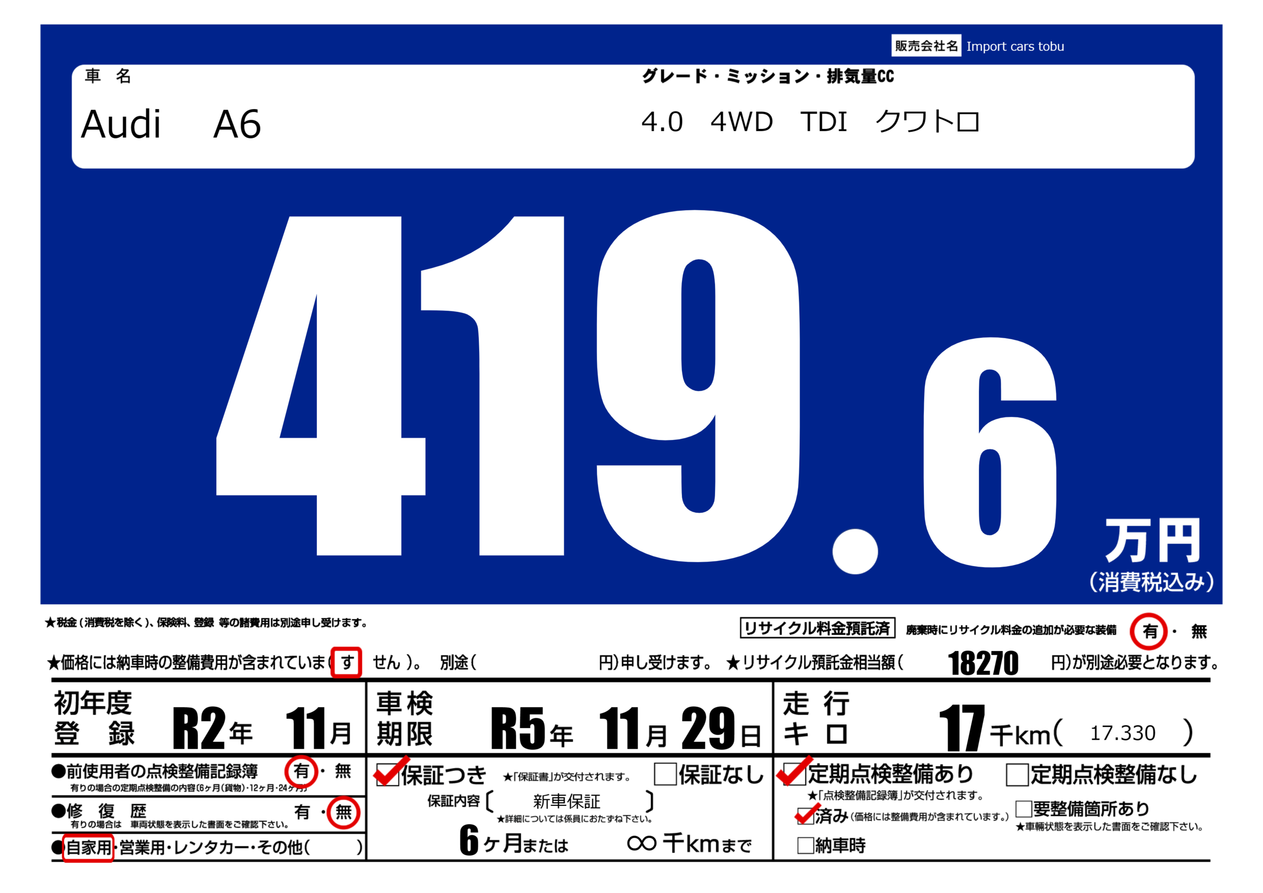 | 車名 | Audi A6 | グレード ミッション 排気量 |