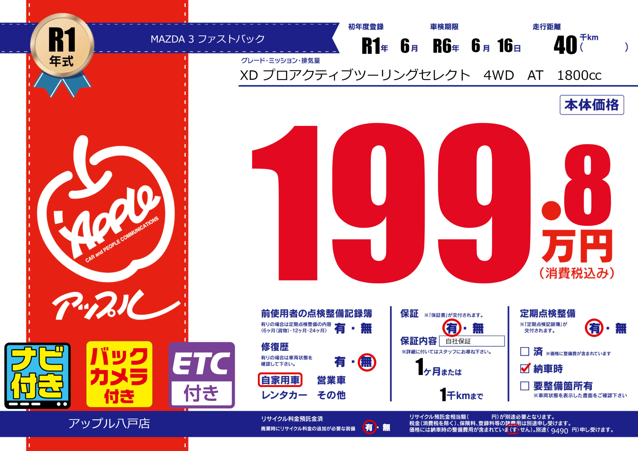 保証付き 保証内容( 自社保証) 1ヶ月または(1)千kmまで |