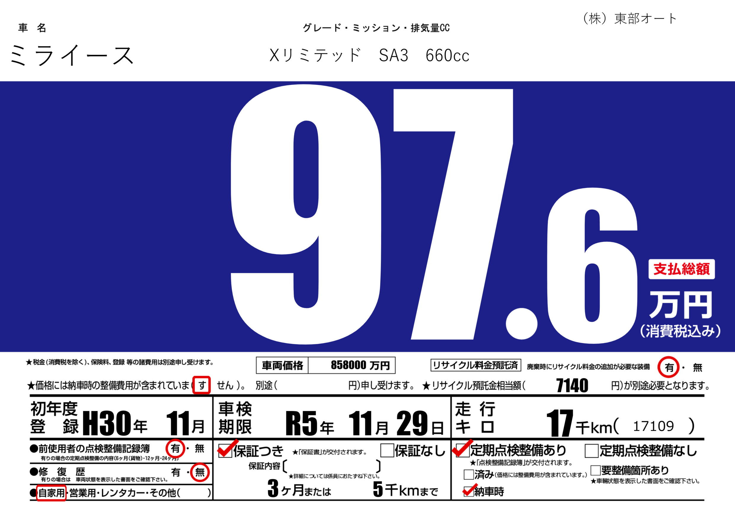 保証付き 保証内容(---) 3ヶ月または(5)千kmまで |