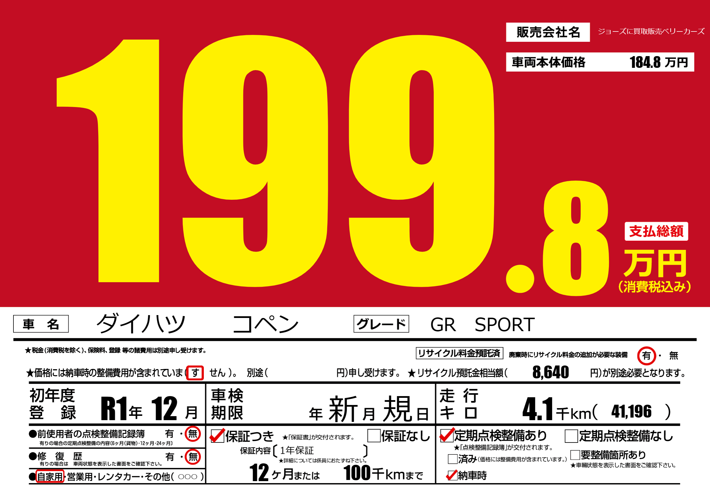 | 車名 | ダイハツ コペン | グレード ミッション 排気量 |