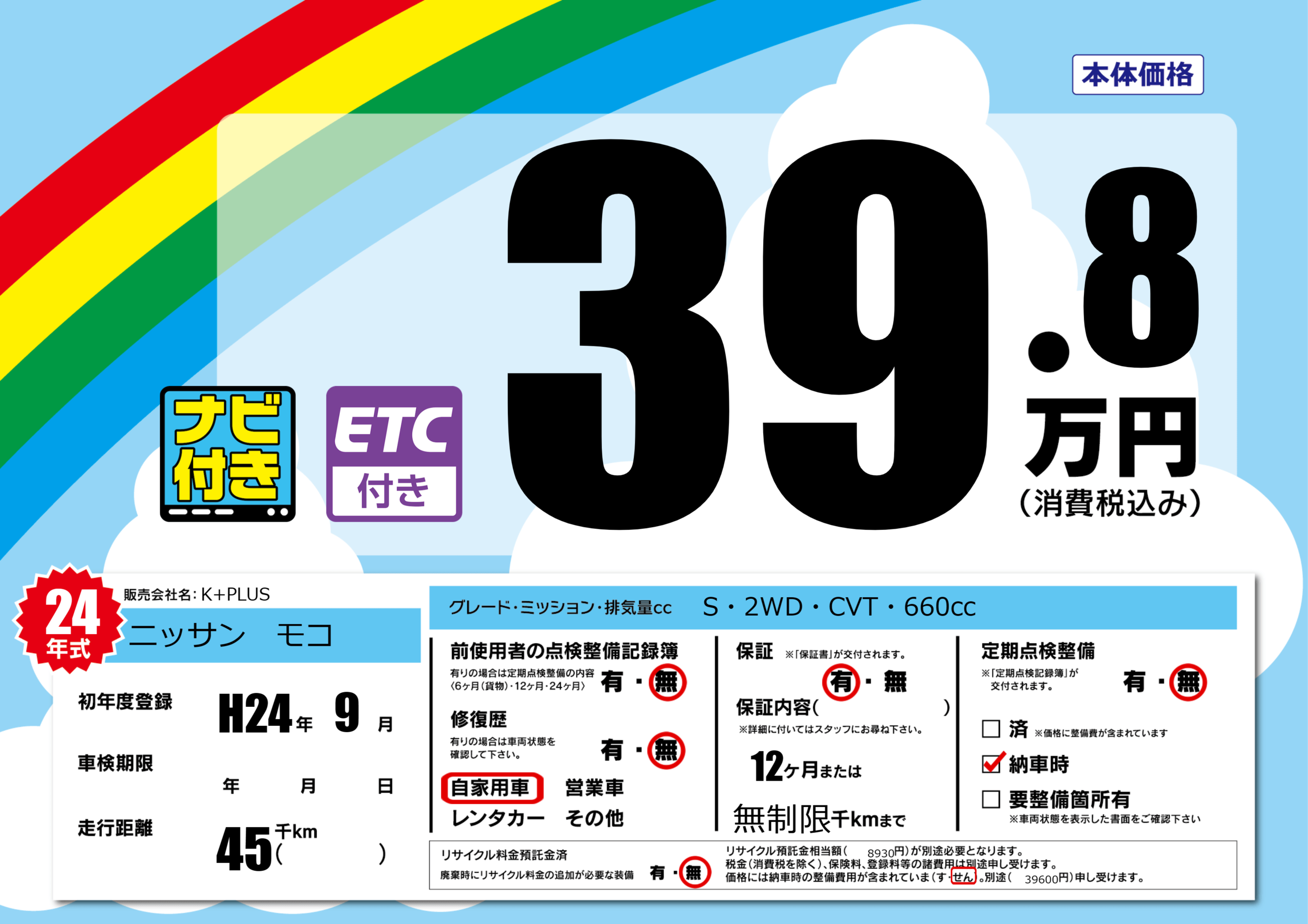 | 定期点検整備 | 定期点検整備なし 納車時あり | ||