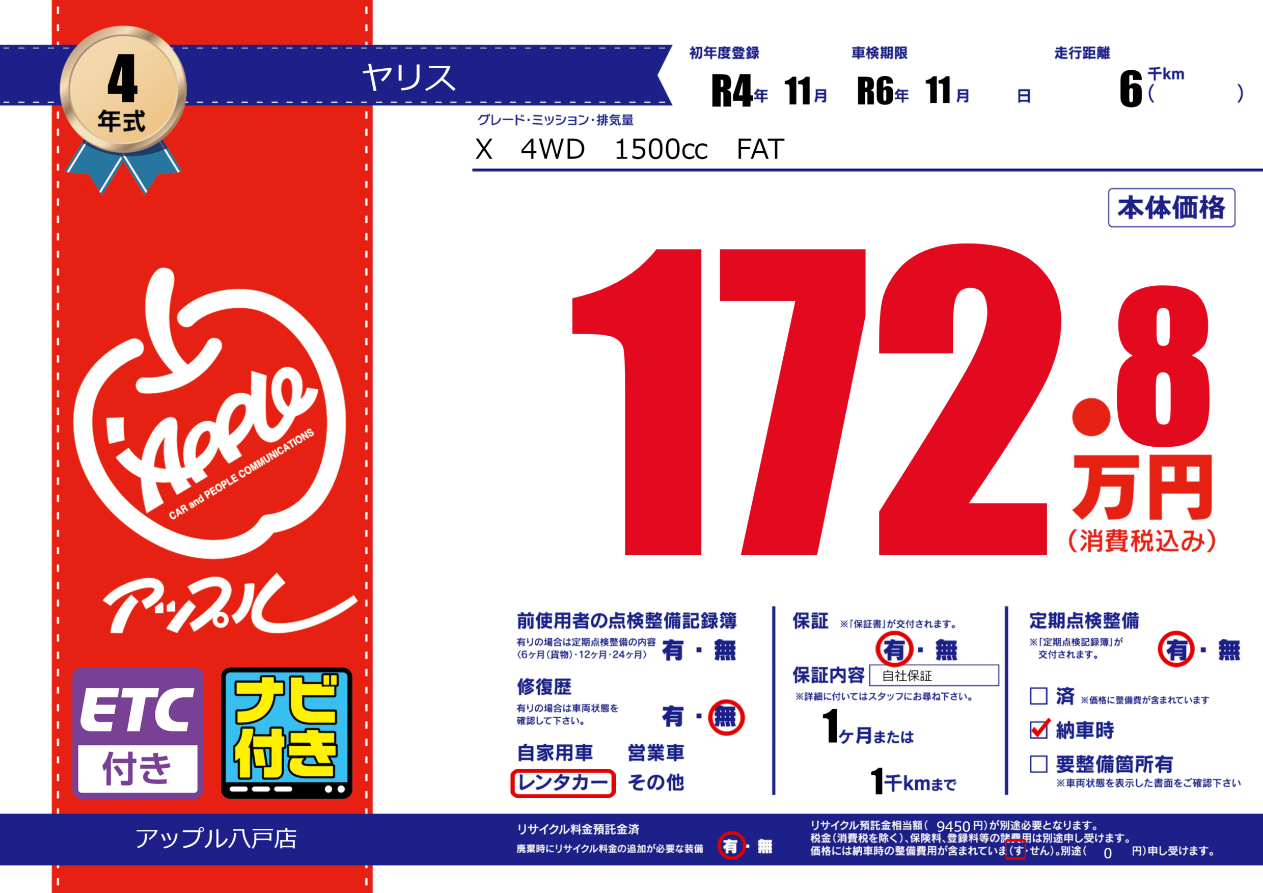 保証付き 保証内容( 自社保証) 1ヶ月または(1)千kmまで |