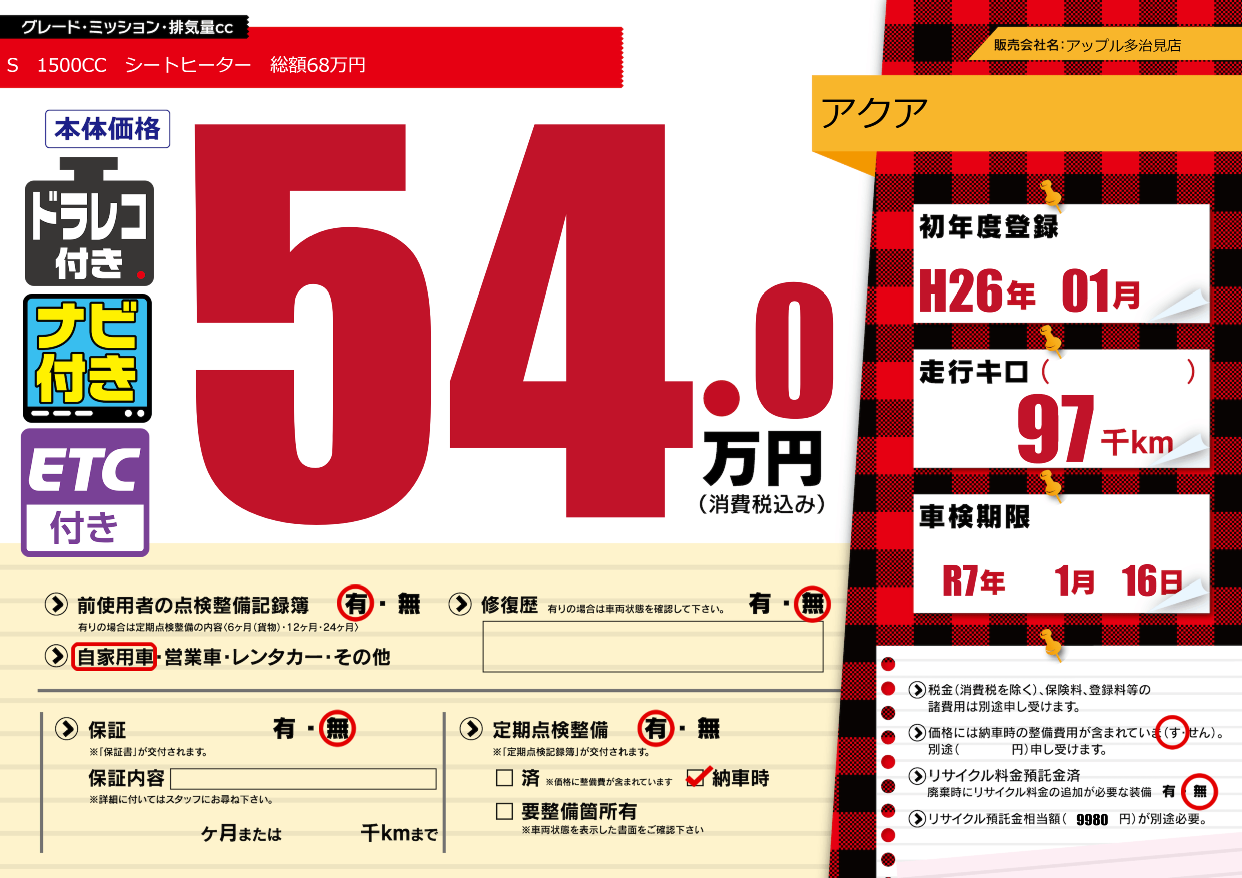 | 定期点検整備 | 定期点検整備あり 納車時あり | ||