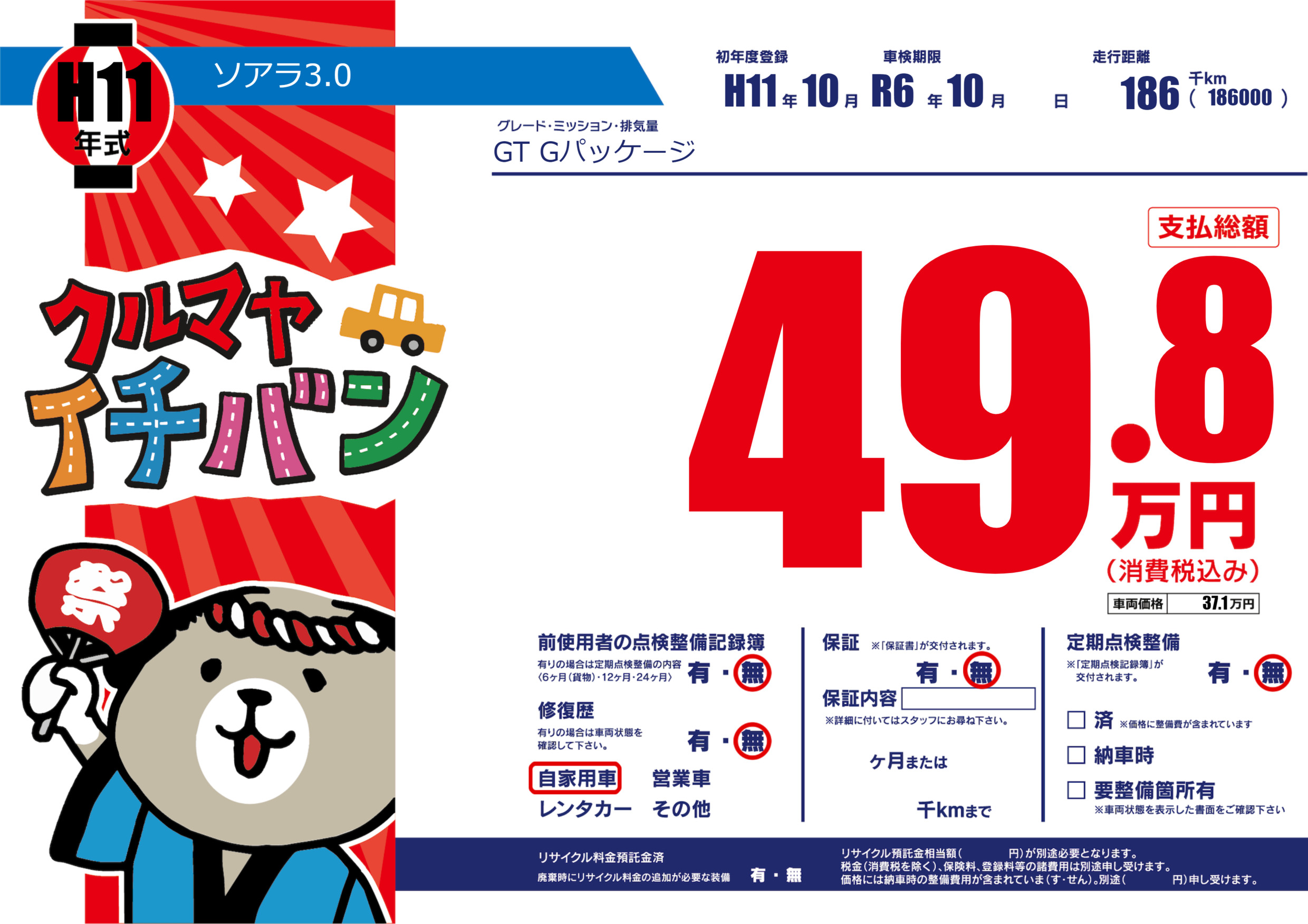 | 走行キロ | 18.6万km | 初年度登録 | H11年10月 |