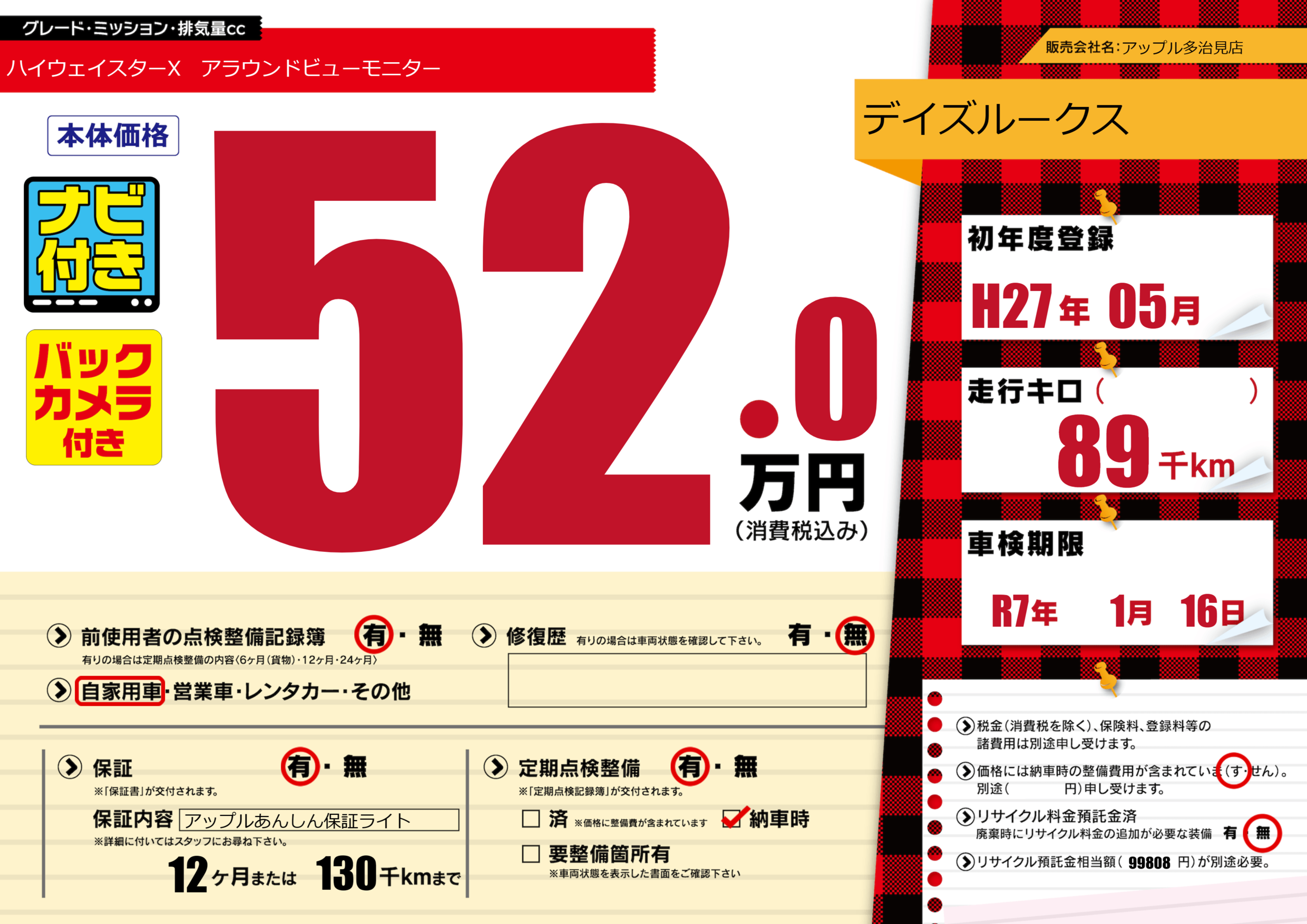 保証付き 保証内容(アップルあんしん保証ライト) 12ヶ月または(130)千kmまで |