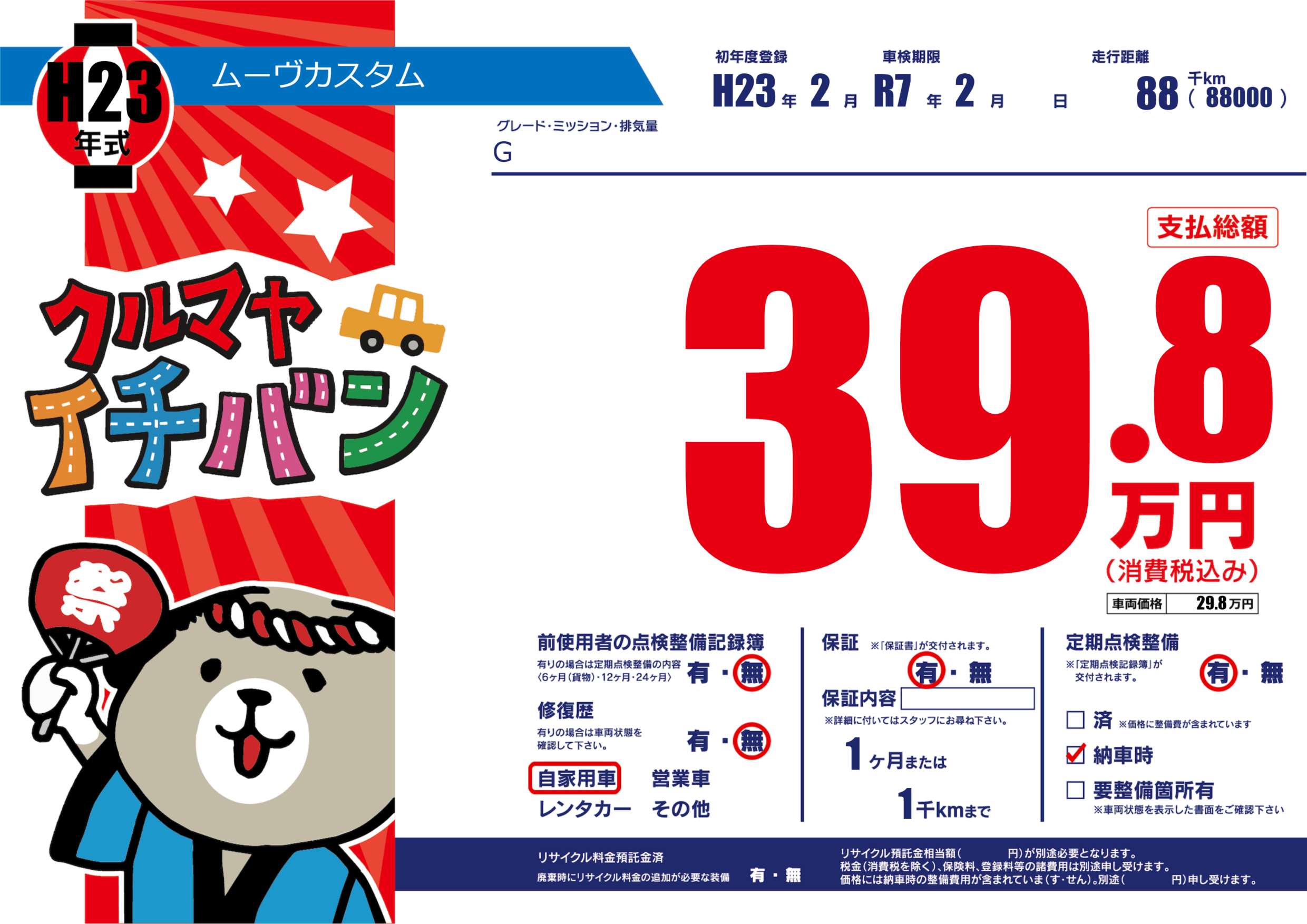| 定期点検整備 | 定期点検整備あり 納車時あり | ||