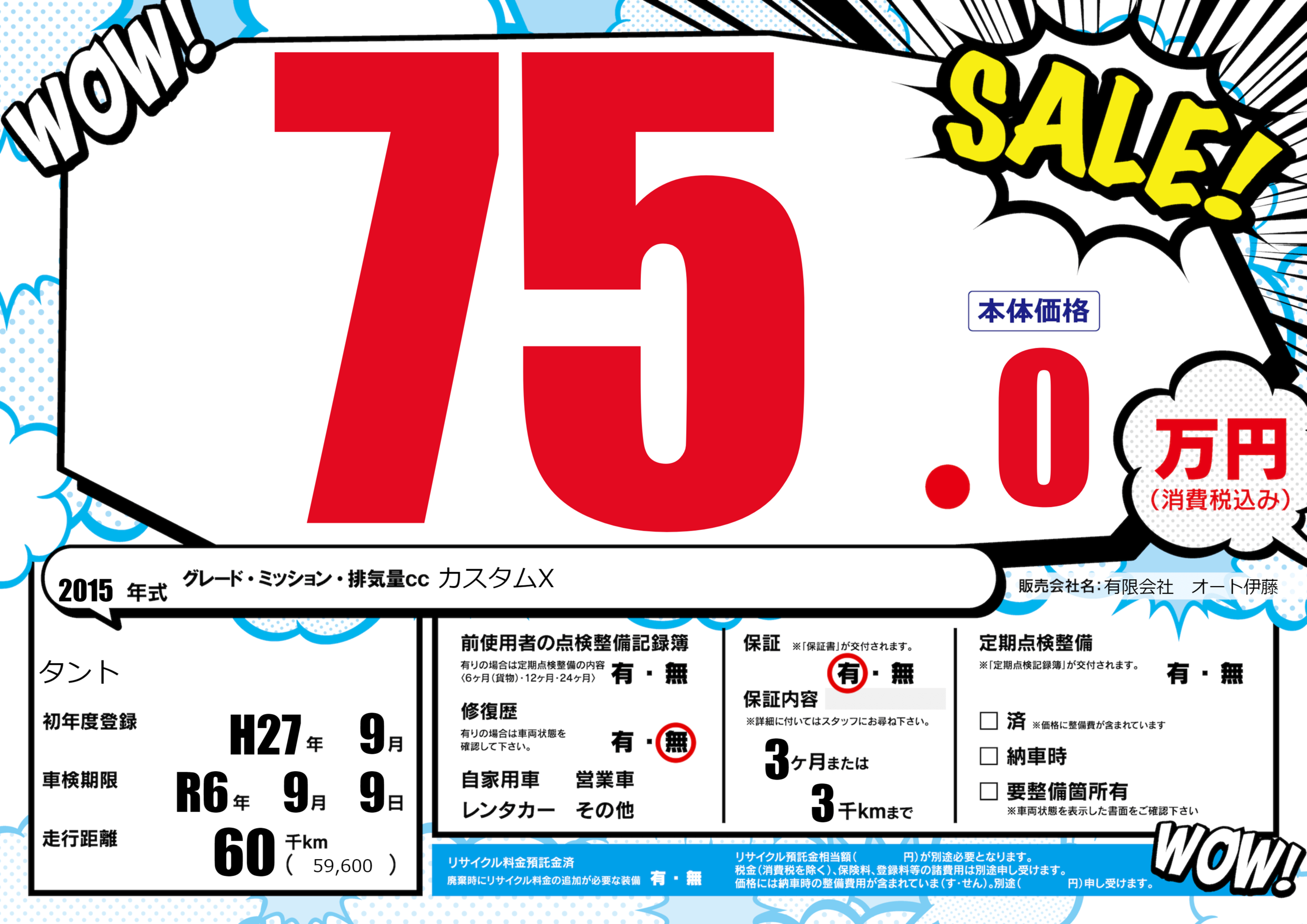 | 走行キロ | 6万km | 初年度登録 | H27年9月 |