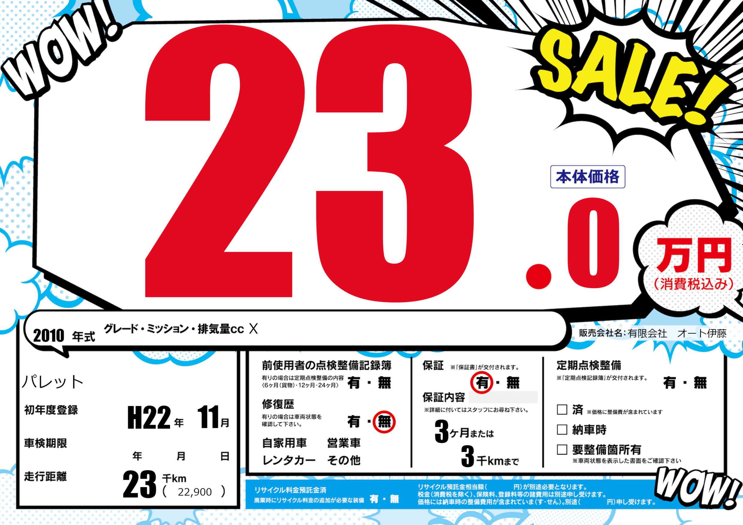 | 走行キロ | 2.3万km | 初年度登録 | H22年11月 |
