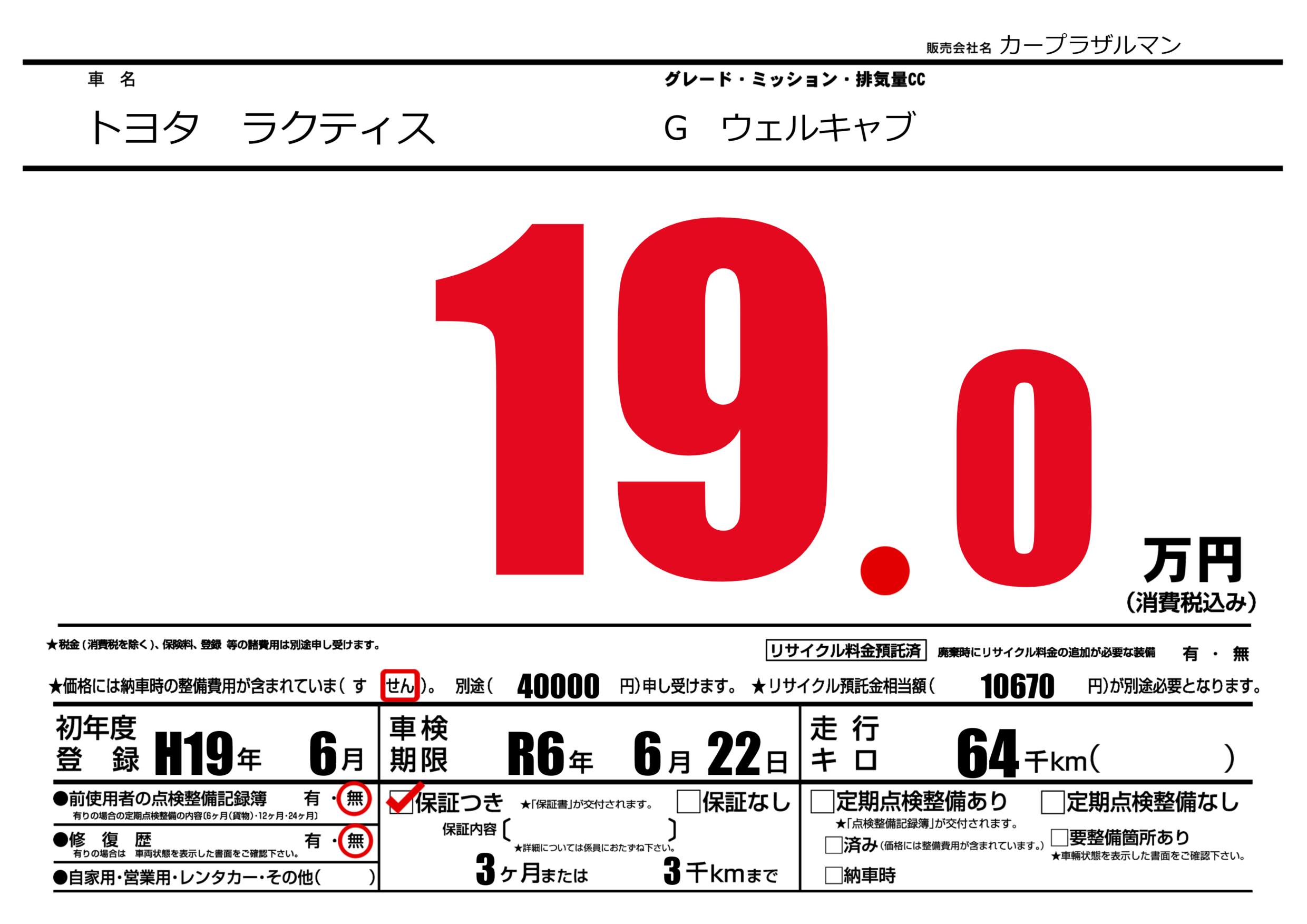 | 車名 | トヨタ ラクティス | グレード ミッション 排気量 |