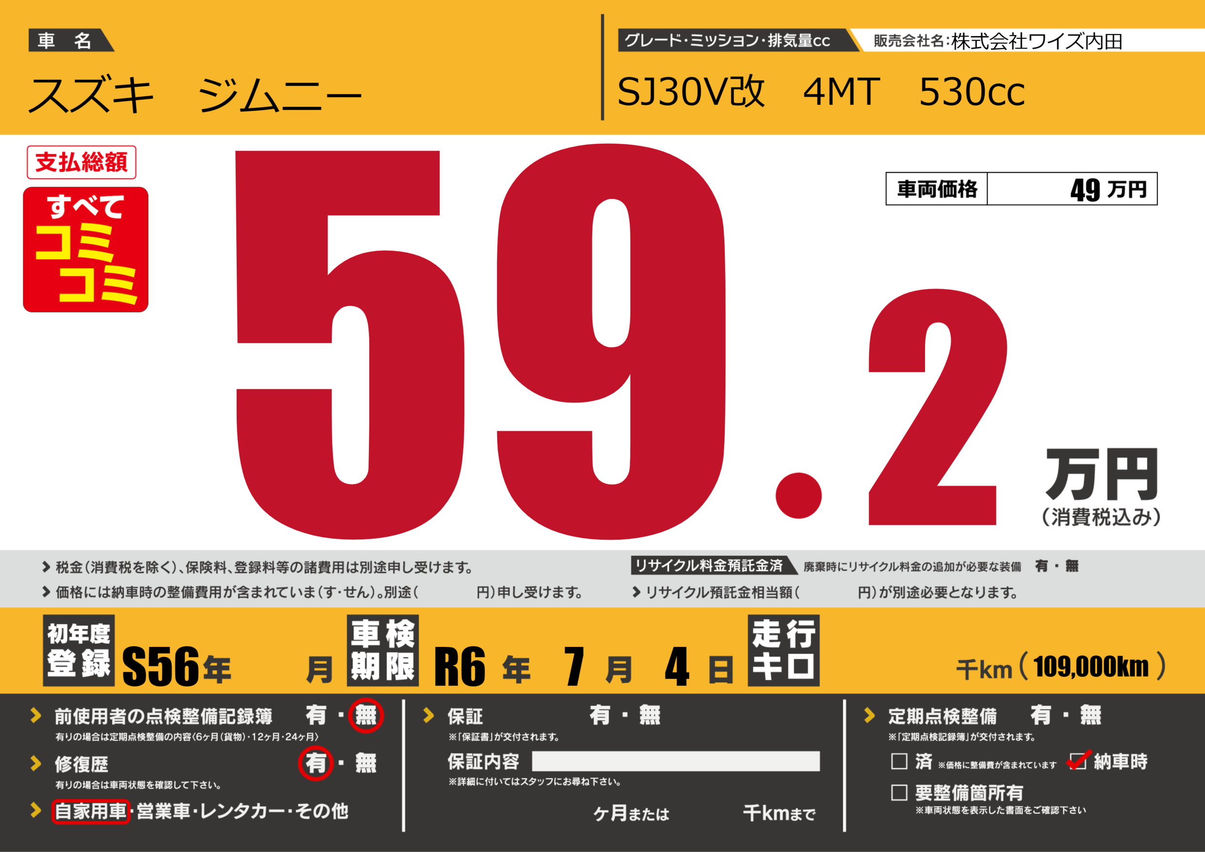 | 車名 | スズキ ジムニー | グレード ミッション 排気量 |