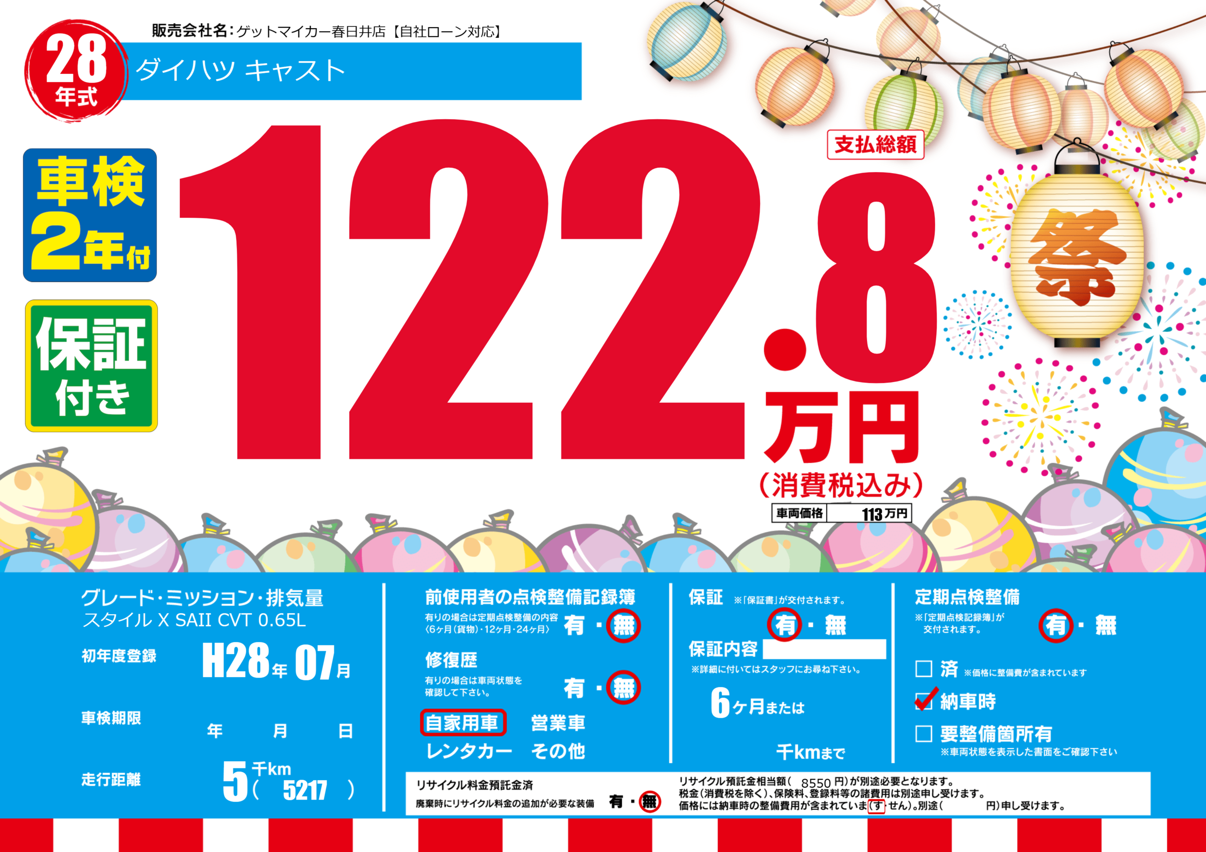 保証付き 保証内容(---) 6ヶ月または()千kmまで |