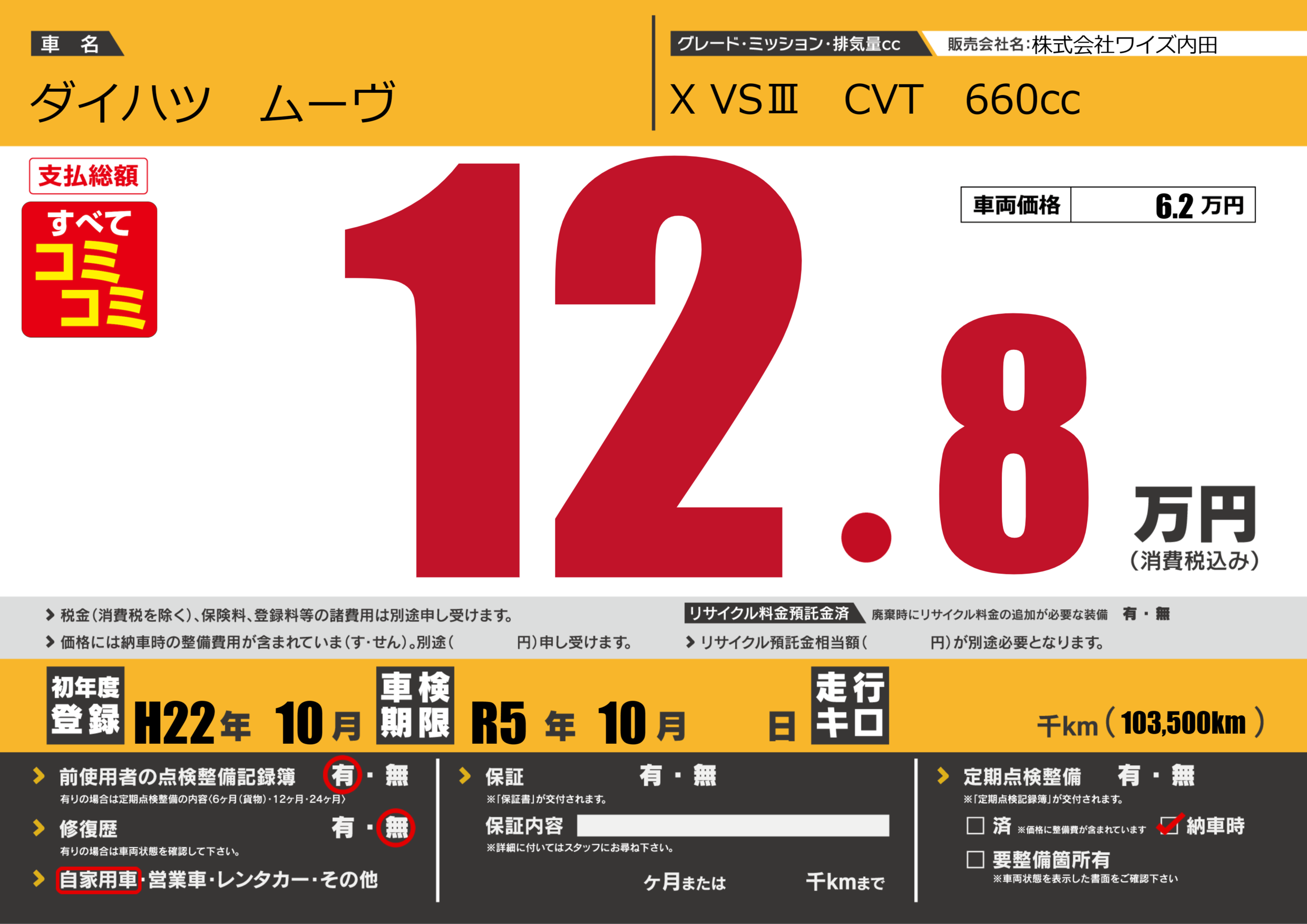 | 車名 | ダイハツ ムーヴ | グレード ミッション 排気量 |