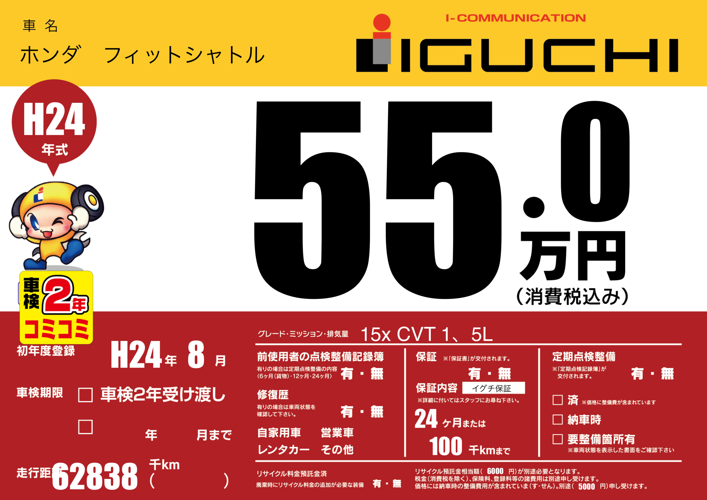 保証なし 保証内容(イグチ保証) 24ヶ月または(100)千kmまで |