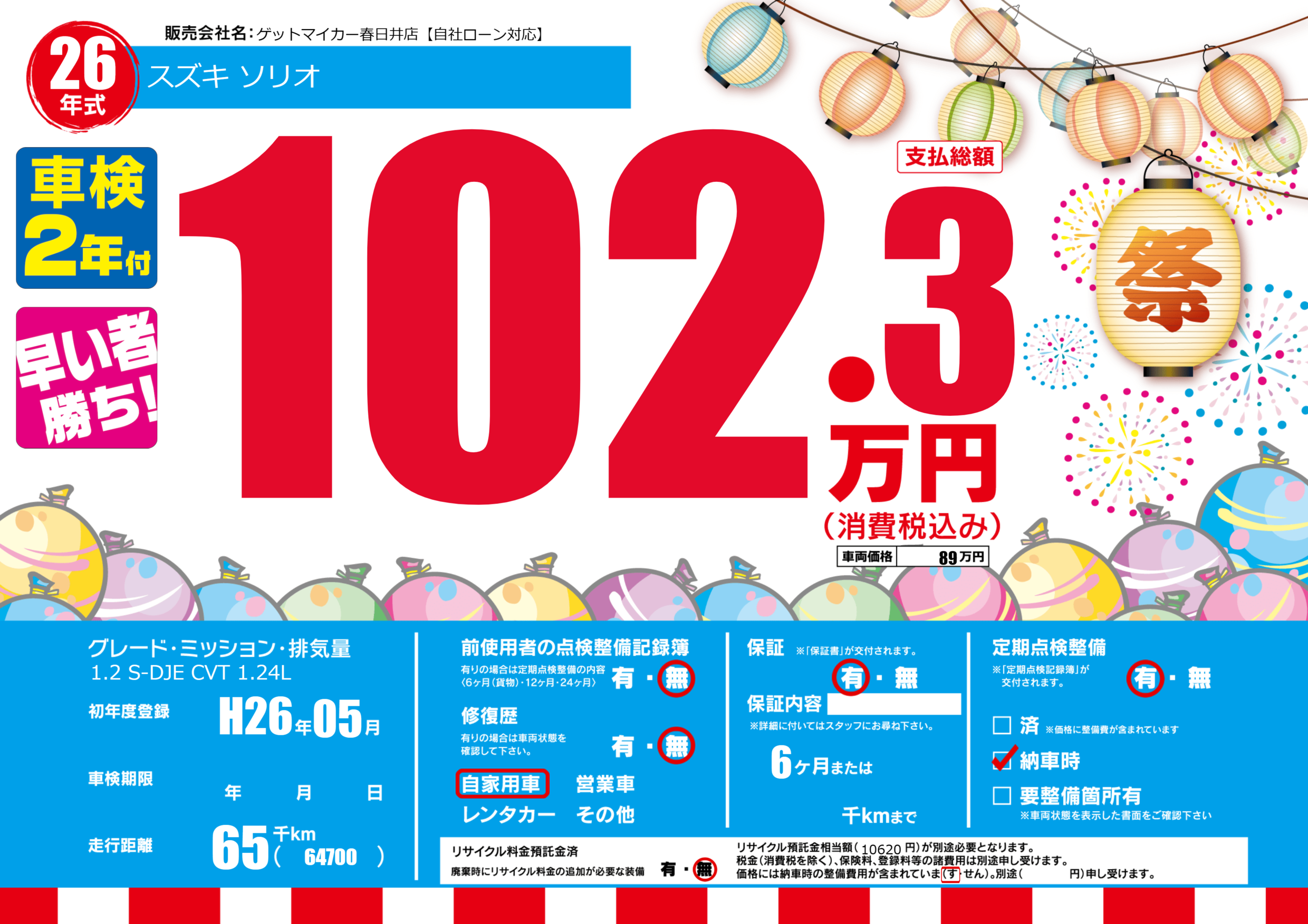| 定期点検整備 | 定期点検整備あり 納車時あり | ||
