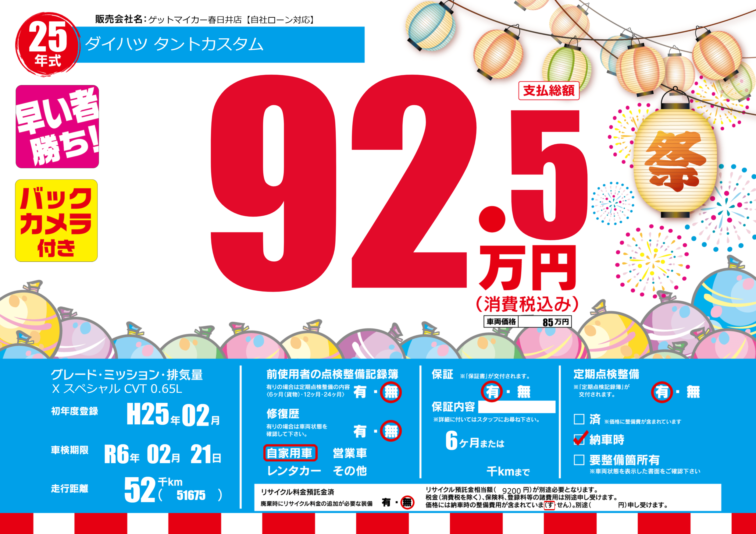 | 車名 | ダイハツ タントカスタム | グレード ミッション 排気量 |