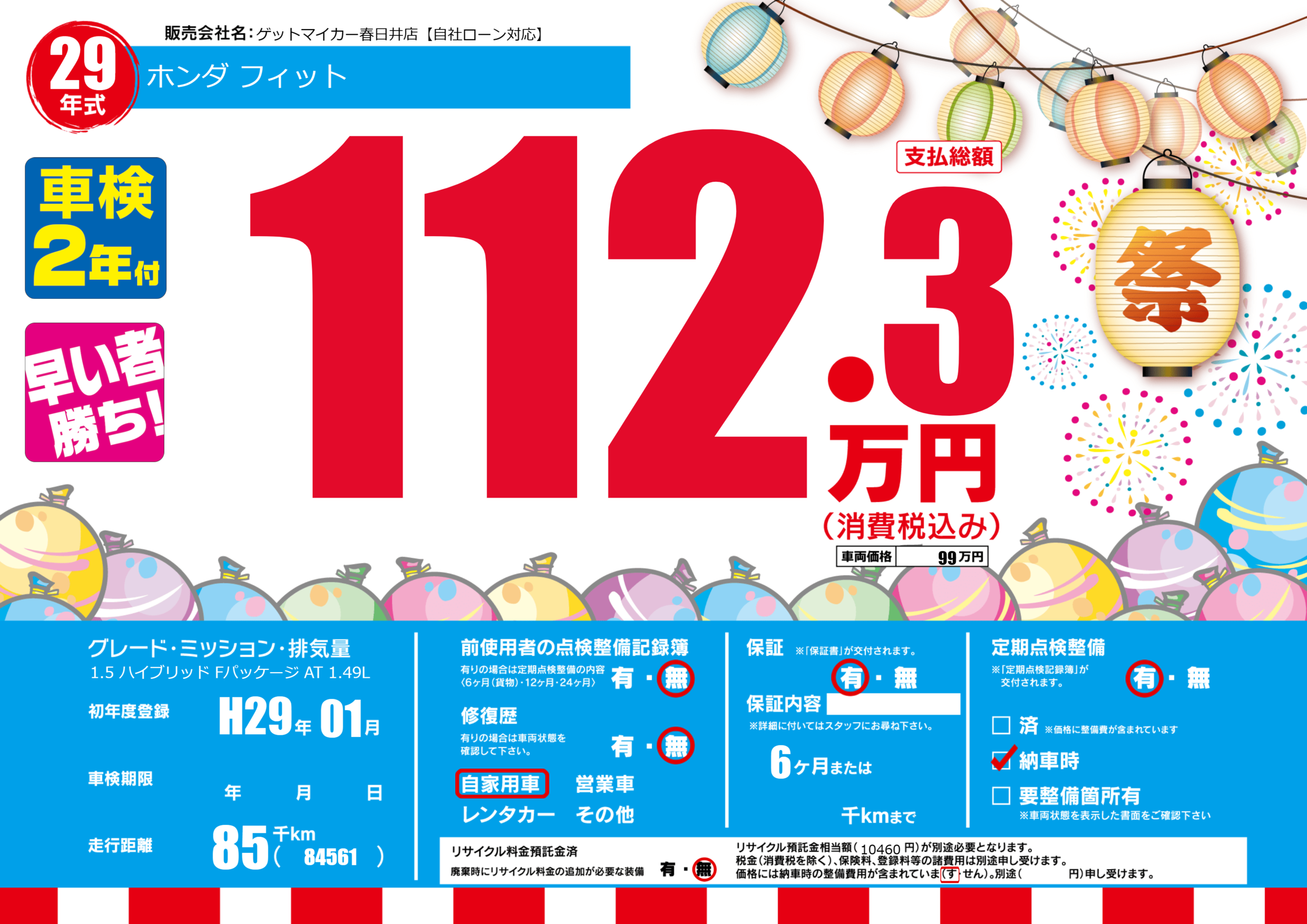 | 車名 | ホンダ フィット | グレード ミッション 排気量 |