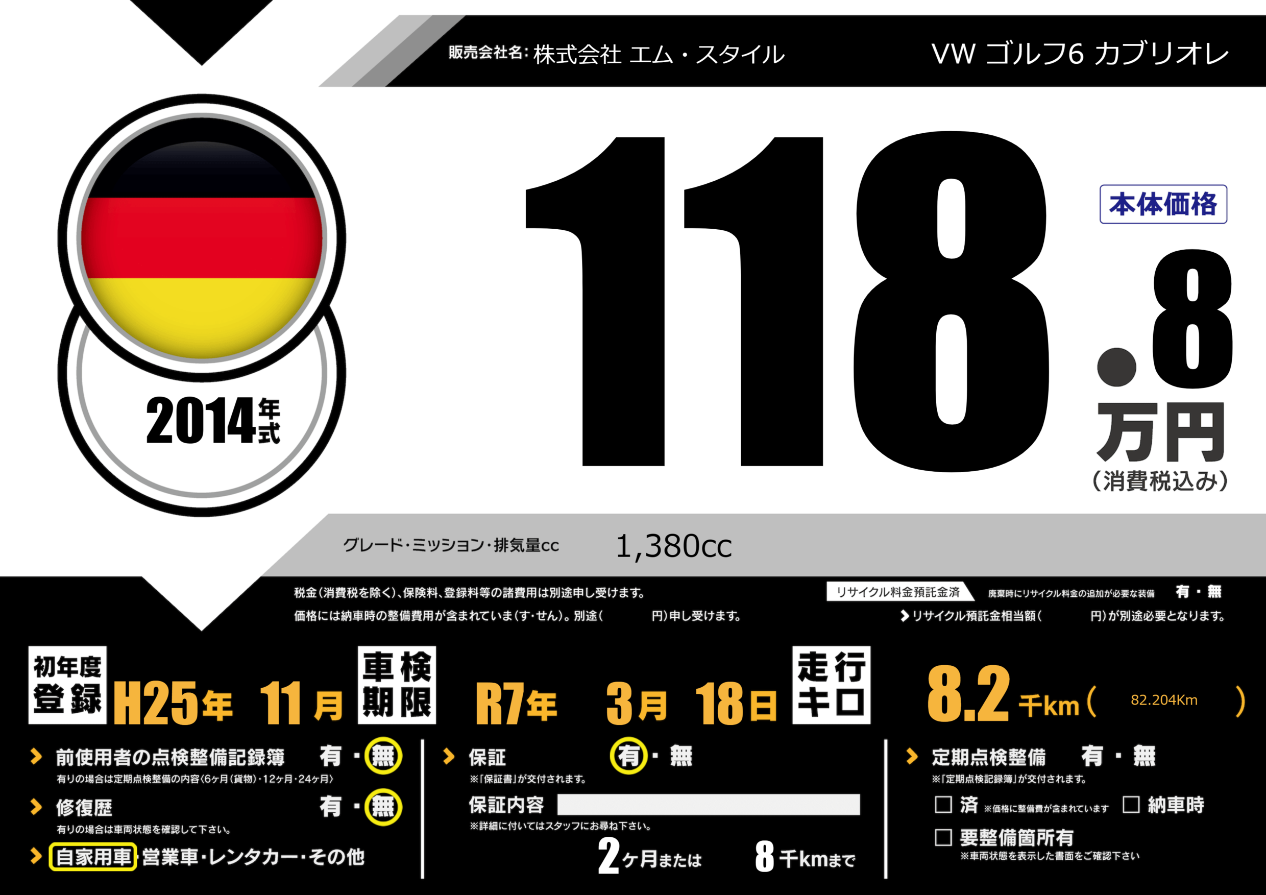 | 車名 | VW ゴルフ6 カブリオレ | グレード ミッション 排気量 |